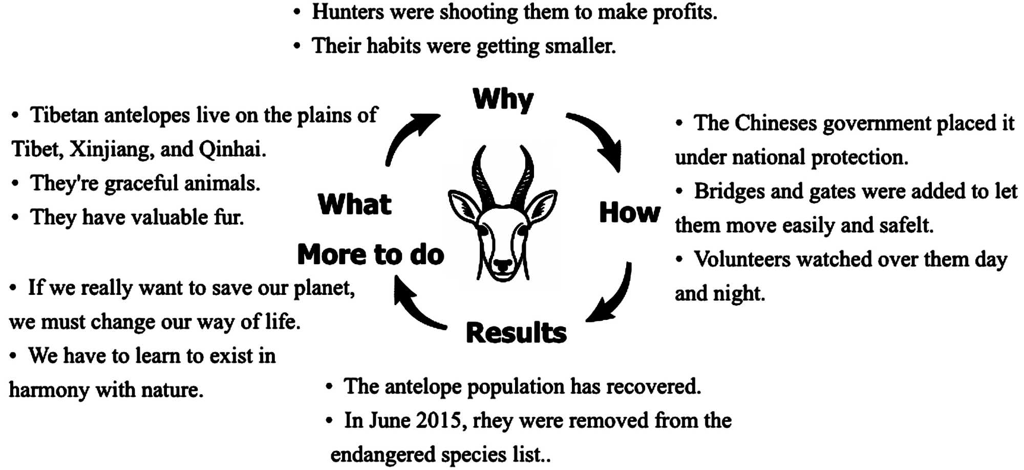 问题2至问题5则是围绕“what I heard”展开的,这四个问题逐步深入,牵扯出文章中的暗线,即problems (问题)、causes (原因)、measures (措施)、results (效果),分别对应思维导图中的Why、How以及Results。教师首先提出问题2,然后逐步追问,层层递进地提出问题3至5。在这种由问题链驱动的探索过程中,学生将文本的细节进行结构化和逻辑化处理,这有助于他们更深入地理解藏羚羊种群面临的生存威胁,例如栖息地破坏、盗猎等问题。同时,学生也能够了解到中国为了保护藏羚羊所实施的具体措施,例如通过将藏羚羊列为国家重点保护动物、设立自然保护区、安排志愿者巡逻防止偷猎、修建桥梁和通道保障藏羚羊迁徙安全等措施,有效恢复了其种群数量,展现了在生态保护方面的显著成效。