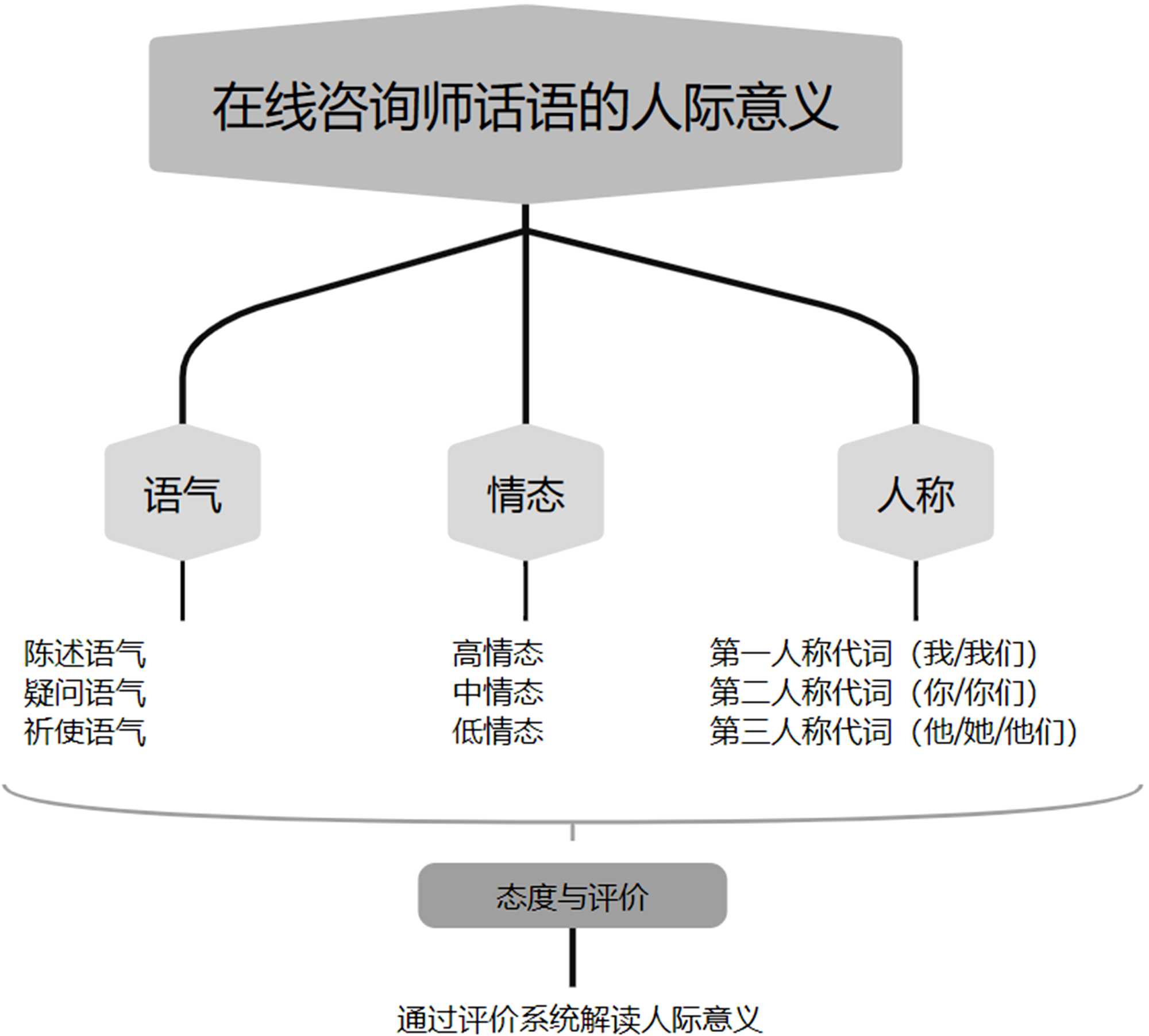 韩礼德(1985)提出了语言在系统功能语法中的三种元功能:概念功能、人际功能和语篇功能[11]。他认为这些元功能适用于所有人类交际系统。在咨询话语中,基于SFL (系统功能语言学)来分析说话者通过使用语气、情态和人称来创造人际意义的语言选择,是一个很好的框架(Halliday, 1994) [12]。