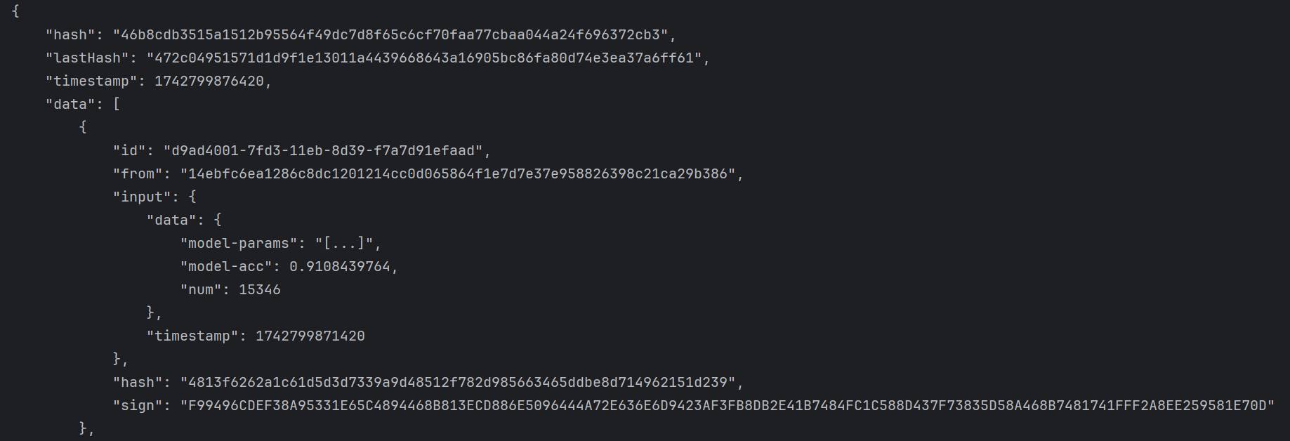 节点在生成本地个性化参数时,调用/getLatestModel接口,获取最新区块信息,如图3所示。其中各个数据项的说明如表2所示。主要有九个数据。hash和lastHash分别表示本区块的哈希值和上一区块的哈希值,如果当前区块为创世区块,hash值为genesis-hash,lastHash值为空。timestamp表示区块生成的时间戳。data里保存了区块包含的模型更新信息,在每一轮训练中,节点通过获取最新区块中所有模型更新信息里的模型参数和训练数据量等计算下一轮全局模型参数。public表示区块生成者的公钥。sign表示客户端用自身私钥对hash值签名后的结果。sequenceNo表示当前区块序号。