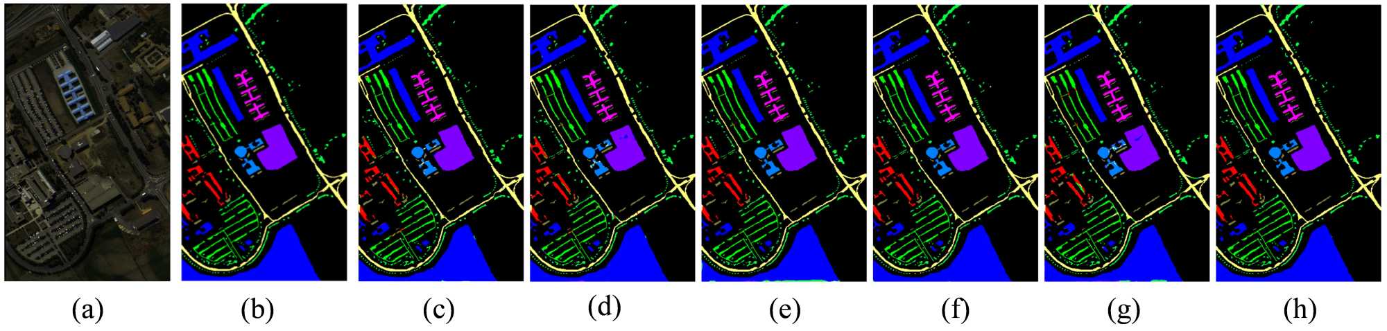 Figure 5. Classification maps of target pixels in the University of Pavia hyperspectral image by different comparative network models: (a) Pseudo-color image of the PU dataset; (b) True image; (c) 2D CNN; (d) 3D CNN; (e) GAHT; (f) HybridSN; (g) SpectralFormer; (h) Classification map obtained by SSCST