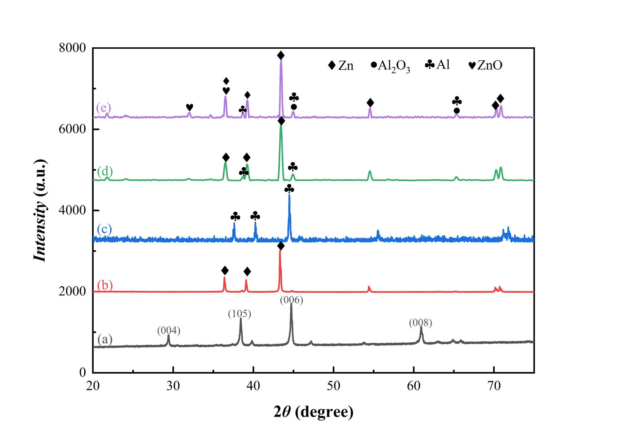 图2. (a) NdFeB基材、(b) Zn涂层、(c) Al涂层、(d) ZnAl涂层以及(e) ZnO-ZnAl涂层XRD图谱