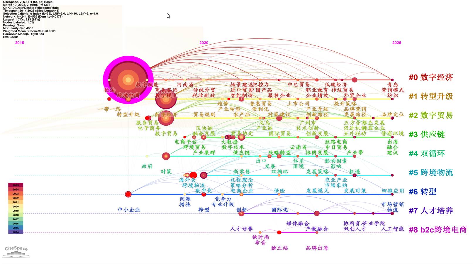 本研究采用CiteSpace进行系统分析,以揭示数字化跨境电商领域的研究热点、演进路径及前沿趋势。CiteSpace作为一种知识图谱分析工具,可通过共引分析和可视化网络有效识别研究领域的核心结构与发展方向。本研究主要采用四项核心分析功能。热点时序分析用于识别核心议题及新兴热点,揭示研究的理论基础与关键知识节点。关键词共现分析通过构建关键词网络,识别研究热点及其内在关联,明确研究内容结构。关键词聚类分析进一步划分关键词网络,系统梳理数字化跨境电商的主要研究主题及方向。关键词突现分析用于探测特定时间段内快速兴起的关键词,捕捉最新研究热点与未来趋势。通过上述分析,本研究系统呈现数字化跨境电商领域的研究脉络,为理论深化和实践创新提供重要支撑。