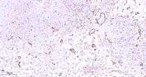 假手术组CD31表达持续低水平;实验1组血管网络密度进一步增加,新生血管结构成熟;实验2组染色强度较14D略有上升,但仍低于实验1组;实验3组血管密度下降,部分区域退行性改变;实验4组血管排列紊乱,染色强度显著低于实验1组。见图片4如下,顺序为假手术组、实验1组、实验2组、实验3组、实验4组。