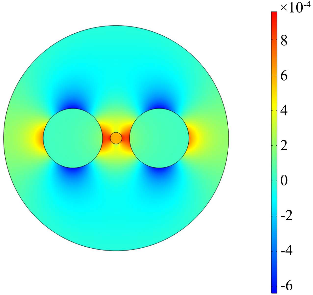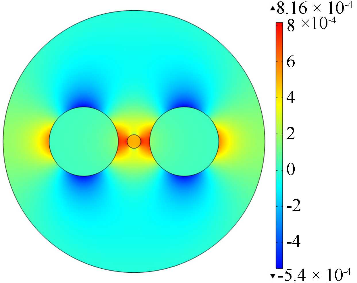 由于光弹效应的存在,可根据公式(3)~(5)计算出光纤内部各部分折射率的值,再根据式(6)可计算出光纤中各点双折射的值,其中第一光弹系数C1 = 0.757245 × 10−12,第二光弹系数C2 = 4.18775 × 10−12。