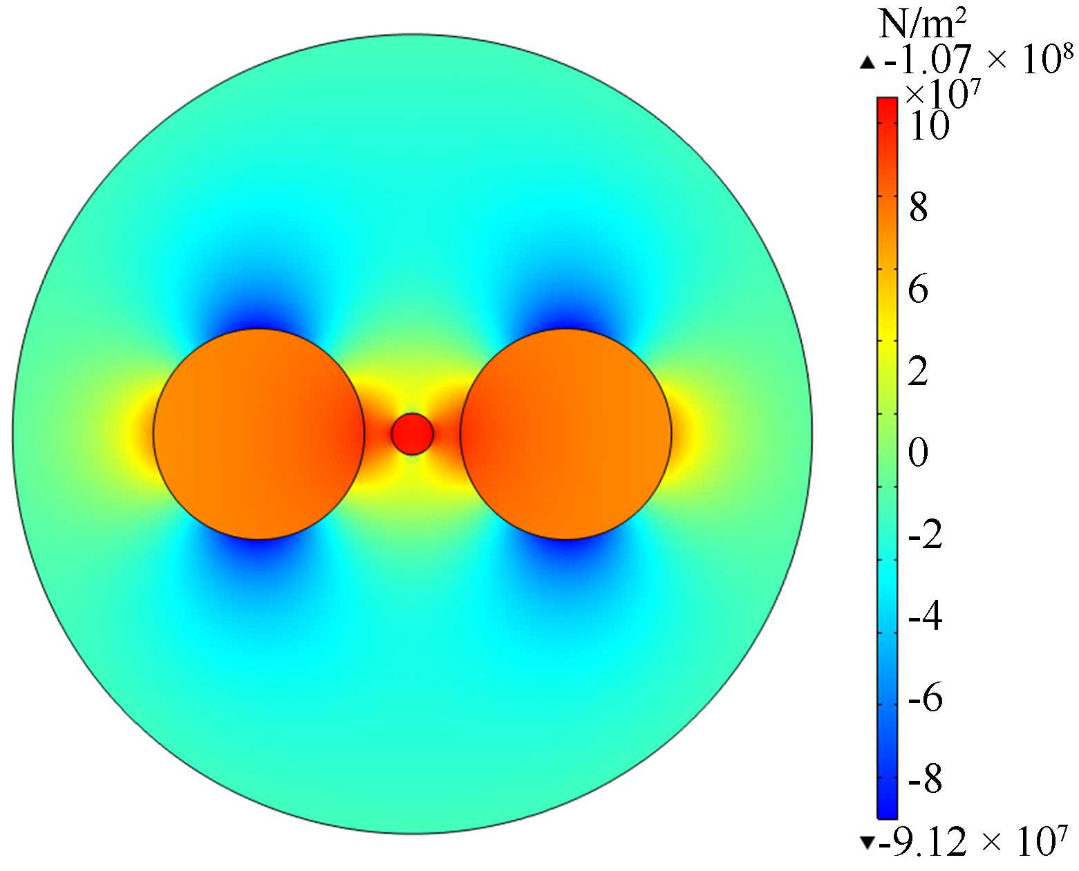 仿真采用熊猫型保偏光纤(PMF, PM1550-HP)进行仿真分析。如图2所示,分别将纤芯直径2r0设为6.5 μm,应力区直径2r1设为33 μm,包层直径2r2设为125 μm,纤芯中心点与应力区中心点的距离d设为24 μm。分别设置截面内材料的杨氏模量