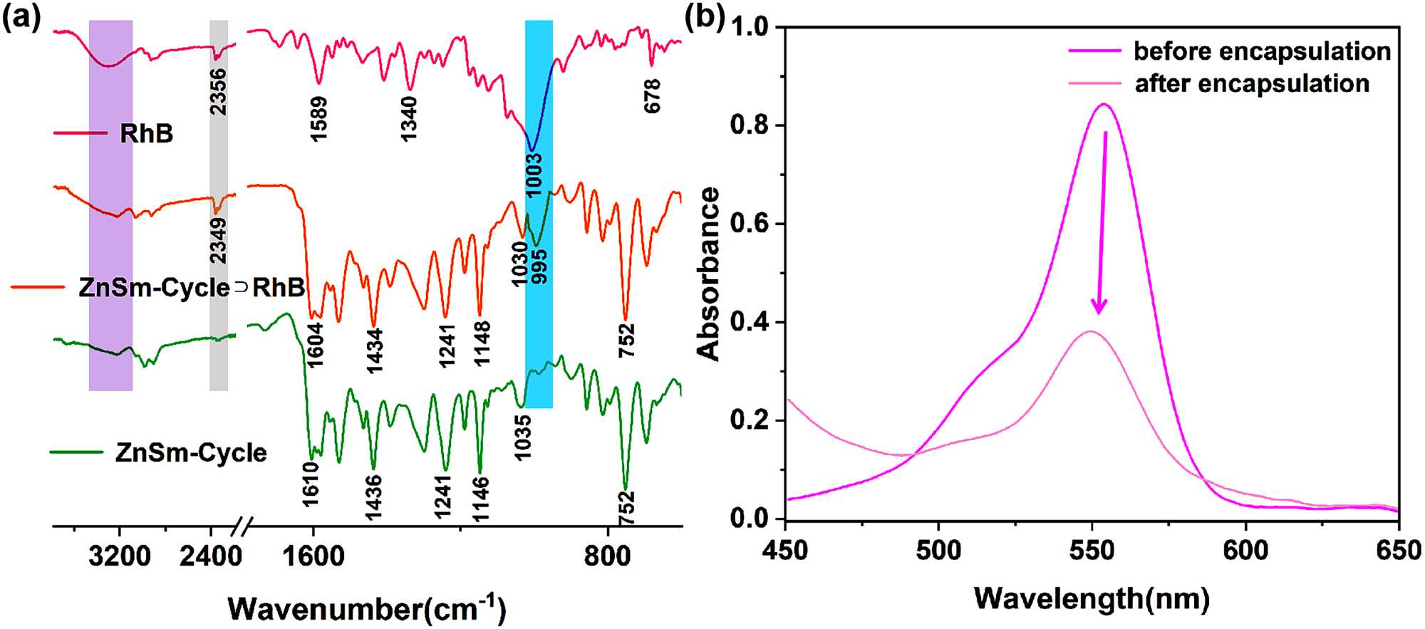 图1. (a) RhB、ZnSm-Cycle以及ZnSm-Cycle⊃RhB的红外光谱;(b) 封装前后的RhB的乙酸乙酯溶液的紫外吸收曲线变化