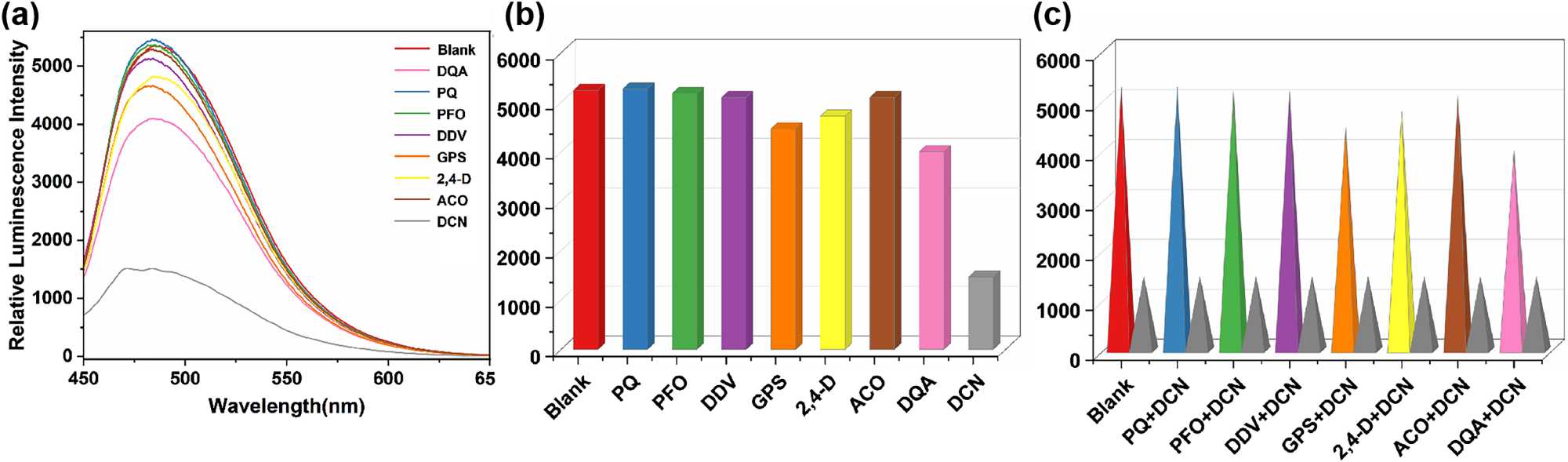 Figure 2. (a) Comparative emission spectra of ZnSm-Cycle-3%@PMMA hybrid film upon addition of different pesticides; (b) Bar chart representation of relative fluorescence intensity changes of the hybrid film after pesticide addition; (c) Competitive sensing experiments for DCN detection by the hybrid film in the presence of various pesticides