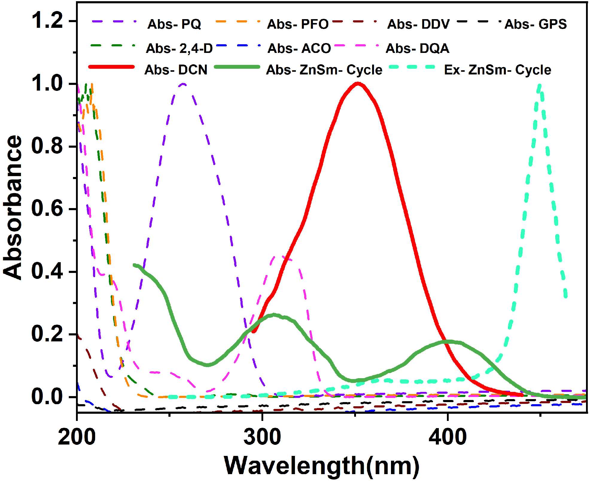 Figure 4. UV-vis absorption and excitation spectra of compound ZnSm-Cycle, together with UV-vis absorption spectra of pesticide aqueous solutions (50 μM)