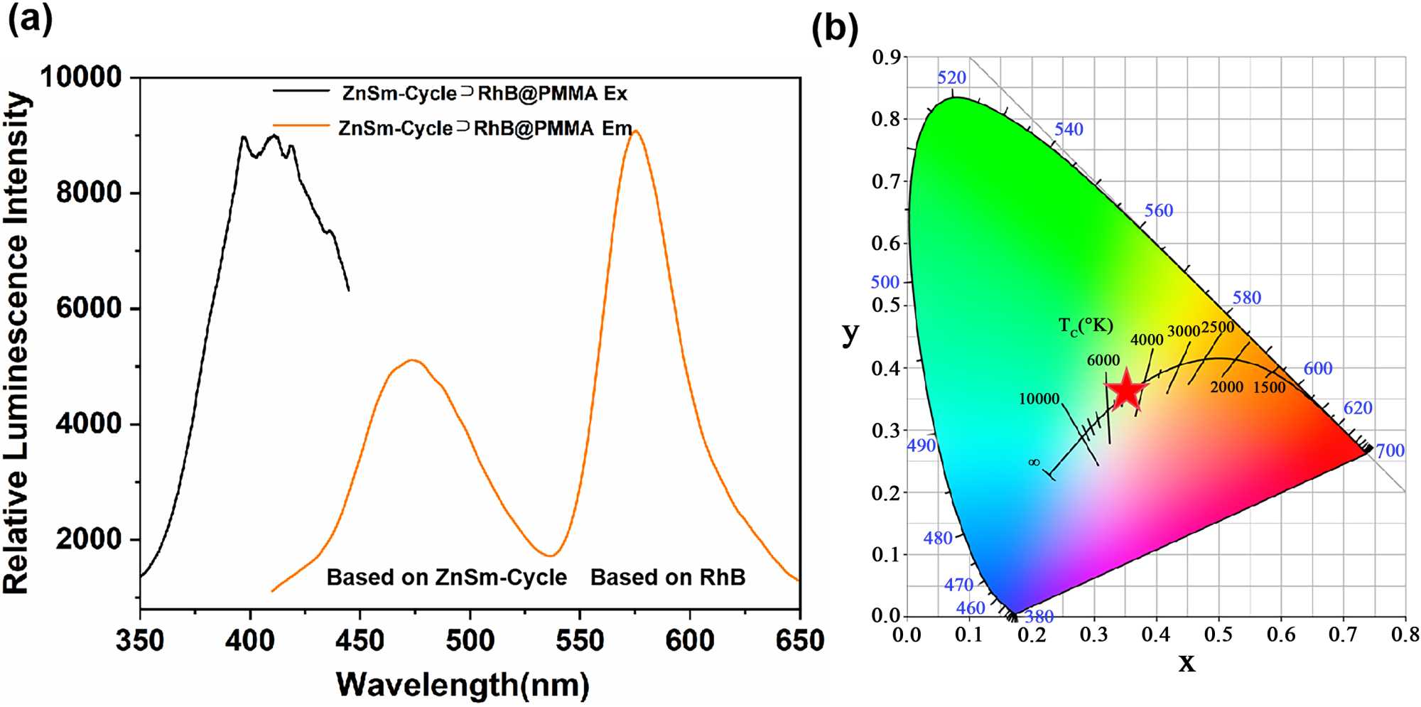 Figure 7. (a) Excitation and emission spectra of the ZnSm-Cycle⊃RhB@PMMA hybrid film; (b) Corresponding CIE chromaticity coordinates for the emission spectrum of the hybrid film