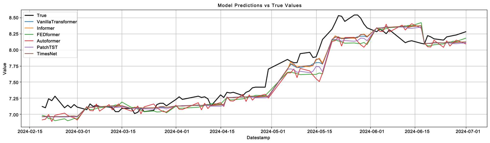 本文选取浦发银行(600000.SH)作为对象来预测股票收盘价,在原始Transformer模型的基础上进行改进和扩展,构建基于多种Transformer架构的时间序列预测模型。这些模型(Vanilla Transformer、Informer、FEDformer、Autoformer、PatchTST和TimesNet)都基于原始Transformer的自注意力机制,以适应时间序列预测的特殊需求。同时,与传统的ARIMA模型和VAR模型进行性能对比分析,得出以下结论: