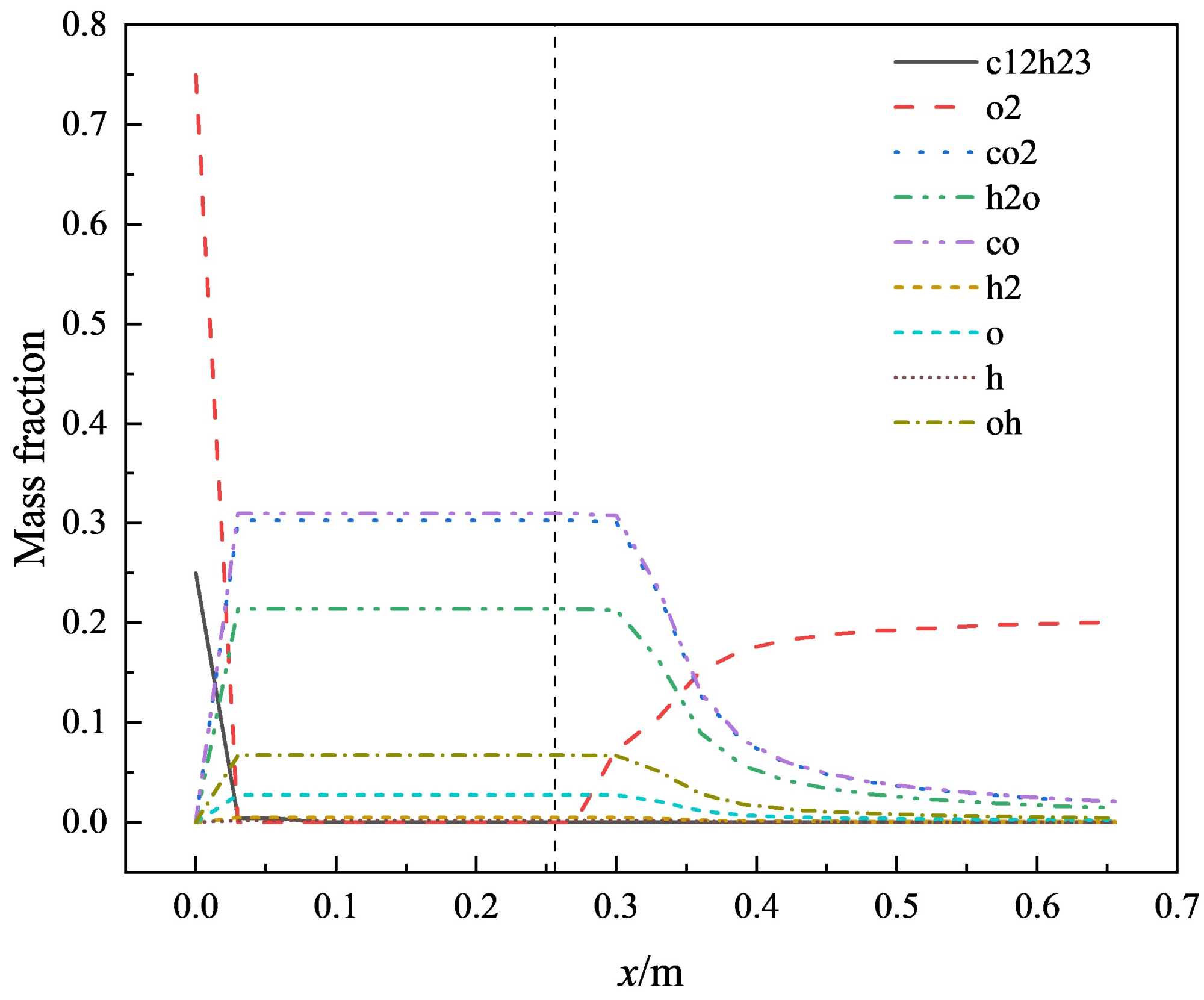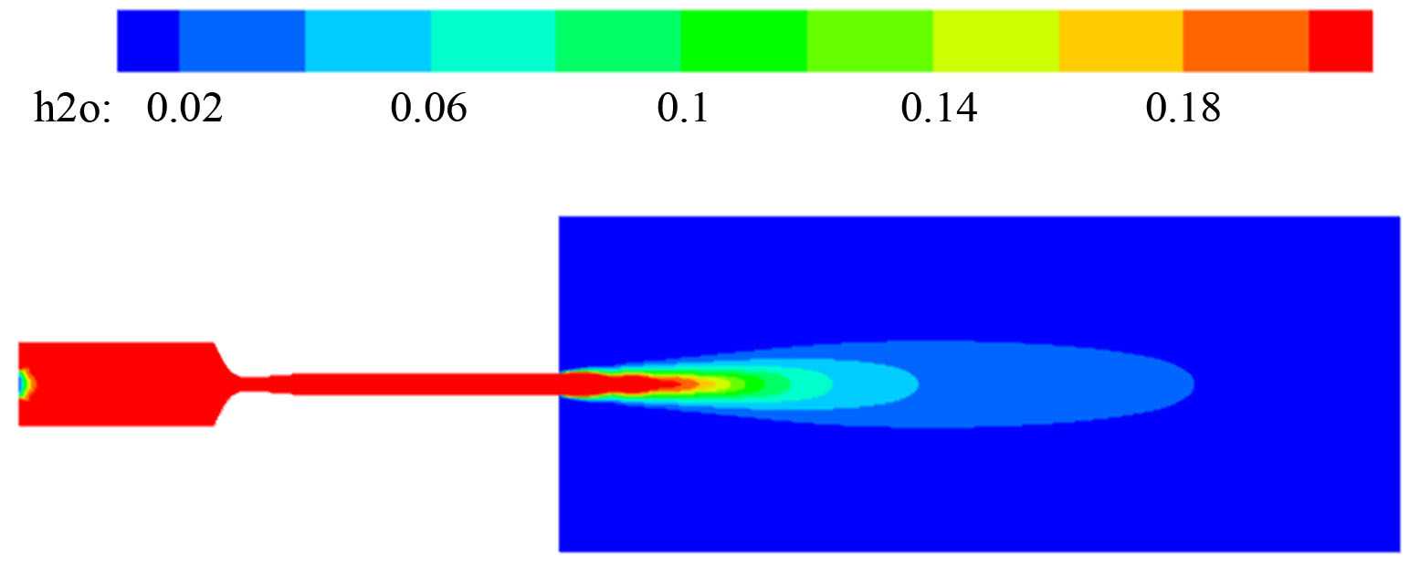 反应产物组分的质量分数云图如图5所示。用函数图显示各组分沿x轴的浓度变化,如图7所示。由图5的计算可知,喷入燃烧室的煤油在轴向瞬时浓度较高。随着与氧气混合的加剧且完全燃烧,煤油消耗迅速,而氧气作为助燃气体使用,入口浓度比较大,消耗相同。燃烧产物CO2、H2O、CO浓度较高,其他产物浓度较低。计算结果定量地揭示了参与程度以及不同产品在火焰流射流过程中的分布情况。