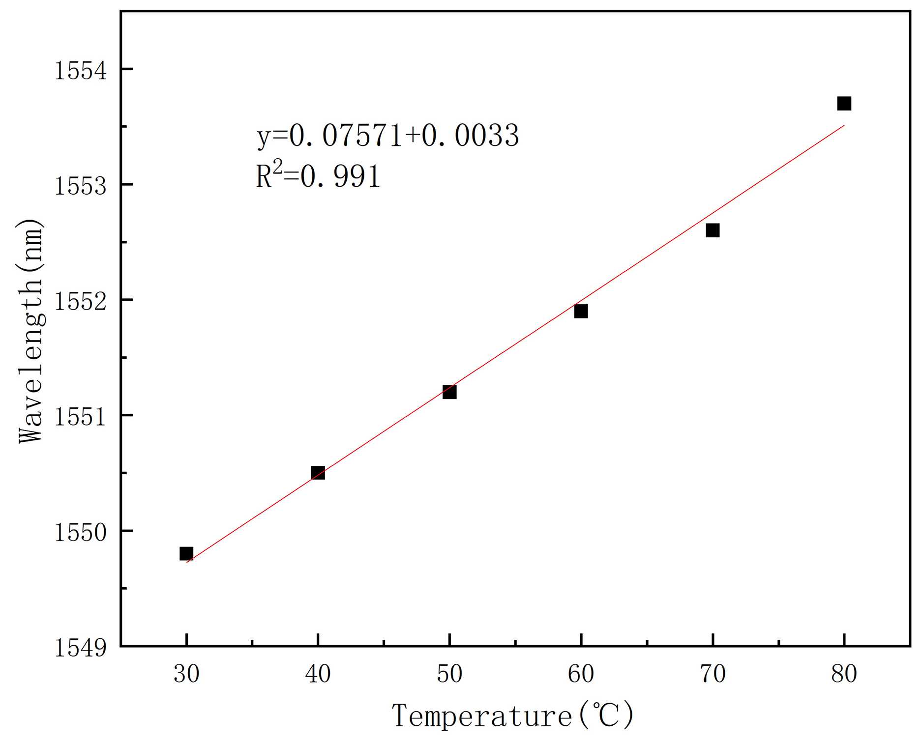 通过应用Origin软件执行线性拟合,探究了特定dip1位置下波长与温度的相关性,拟合结果如图4所示。图表以散点形式展现了在各种温度下dip1所对应的波长分布特征。图表以散点形式展示了在不同温度条件下dip1波长分布特性。依据图表所示,在30℃至80℃的范围内,传感器的温度灵敏度为75.71 pm/℃,波长偏移量与温度变化之间存在良好的线性相关性,且线性拟合度R2为0.99058。