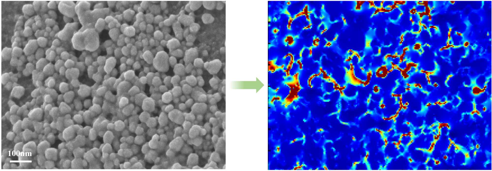 银纳米颗粒的尺寸在30~100 nm范围内,因此模拟网格尺寸选择0.5nm,可以高精度地模拟电场分布。三种SERS基底的SEM图像和FDTD仿真结果分别如图6~8所示。从SEM图片中可以看出,随着生长时间的增加,银纳米颗粒数量逐渐增加。生长时间为40 min时,纤维表面基本被银纳米颗粒全部覆盖了。而生长时间达到60 min时,薄膜致密度继续增加,银纳米颗粒粒径进一步增大,呈现具有棱角的石块状,同时产生了很多狭小的纳米间隙。由于金属纳米颗粒表面的等离子体共振效应会产生强烈的电磁场,使得位于这些区域的探针分子的拉曼信号得到显著放大。根据它们的SEM图像,通过FDTD仿真模拟了三种SERS基底的电场分布,电场强度高即图中的红色区域被称作为热点。结合三种SERS基底的SEM图像和FDTD模拟电场分布来看,可以发现“热点”主要集中在纳米结构之间小于10 nm的纳米间隙处。其中,生长时间60 min得到的SERS基底表面产生了最多的热点。其主要原因是它表面高致密度、大粒径的银纳米颗粒的分布,使得基底表面产生了大量的超小纳米间隙。这也可以从图8中看出,热点分布大多集中在这些超小纳米间隙处,而大量的热点分布使得其具有优越的SERS活性。这证实了SERS检测的实验结果。在生长时间为20 min时,其表面的银纳米颗粒稀疏,颗粒间距大,狭缝很少,只有很小一部分区域产生了热点,这是导致其SERS活性最低的原因。而对于生长时间为40 min时的SERS基底,虽然产生了较多的银纳米颗粒,但致密度仍然不是很高。大部分颗粒的形貌为球形,颗粒间的狭缝数量仍然没有得到有效增加。因此其表面的银纳米颗粒需要进一步生长才能够提高SERS活性。