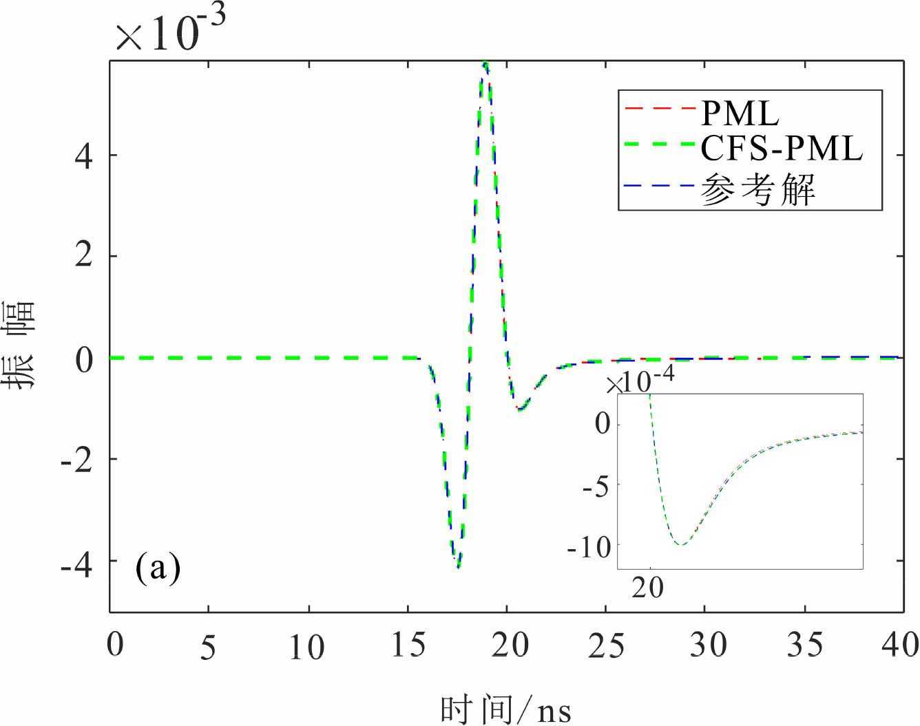 图5是接收点1所收到的PML和CFS-PML边界条件下的单道波形与参考解的对比图,图5展示的是Debye频散介质的结果,而图5(b)呈现的是非频散介质的结果。参考解的获取方式为:把模型的规模扩大至原来的3倍,同时将发射源移至模型的中心位置,在此过程中保持接收点与发射源的相对位置恒定不变。由于此时模型的尺寸足够大,因而在观测范围所对应的时间窗内,不会接收到源自边界的反射波。从图5中可以看出,在接收点1处,基于PML边界条件所得到的单道波形,无法与参考解实现良好的拟合,存在着较大的误差。CFS-PML边界条件的单道波形与参考解几乎完全拟合,与参考解误差几乎为0;结果表明CFS-PML边界条件对掠射波与低频反射波效果强于PML边界条件,与图4中得到的结果相互印证。