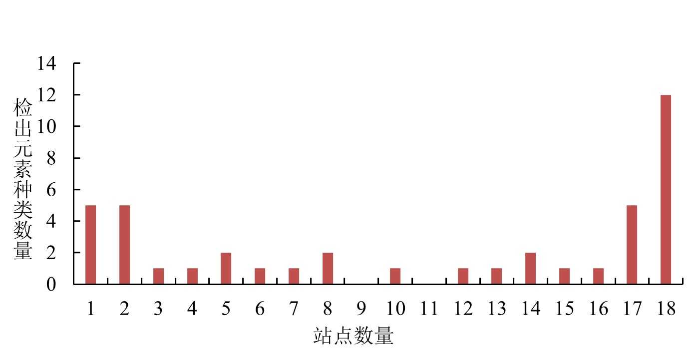 其中12种元素(硼B、钠Na、镁Mg、钾K、钙Ca、钒V、铜Cu、锌Zn、铷Rb、锶Sr、钼Mo、钡Ba)在所有样本中稳定检出(检出率100%),锂(Li)、铝(Al)、锰(Mn)、铁(Fe)等5种元素在17个样本中检出(检出率94.4%),两者占检出元素总量的40.5% (图2),上述元素在金沙江云南段水体中具有普遍性。检出1~2个元素的站点为10个,不同地貌单元之间、单个地貌单元内不同下垫面条件下也有差异,说明地貌对元素溶出的影响较大[4] [5]。