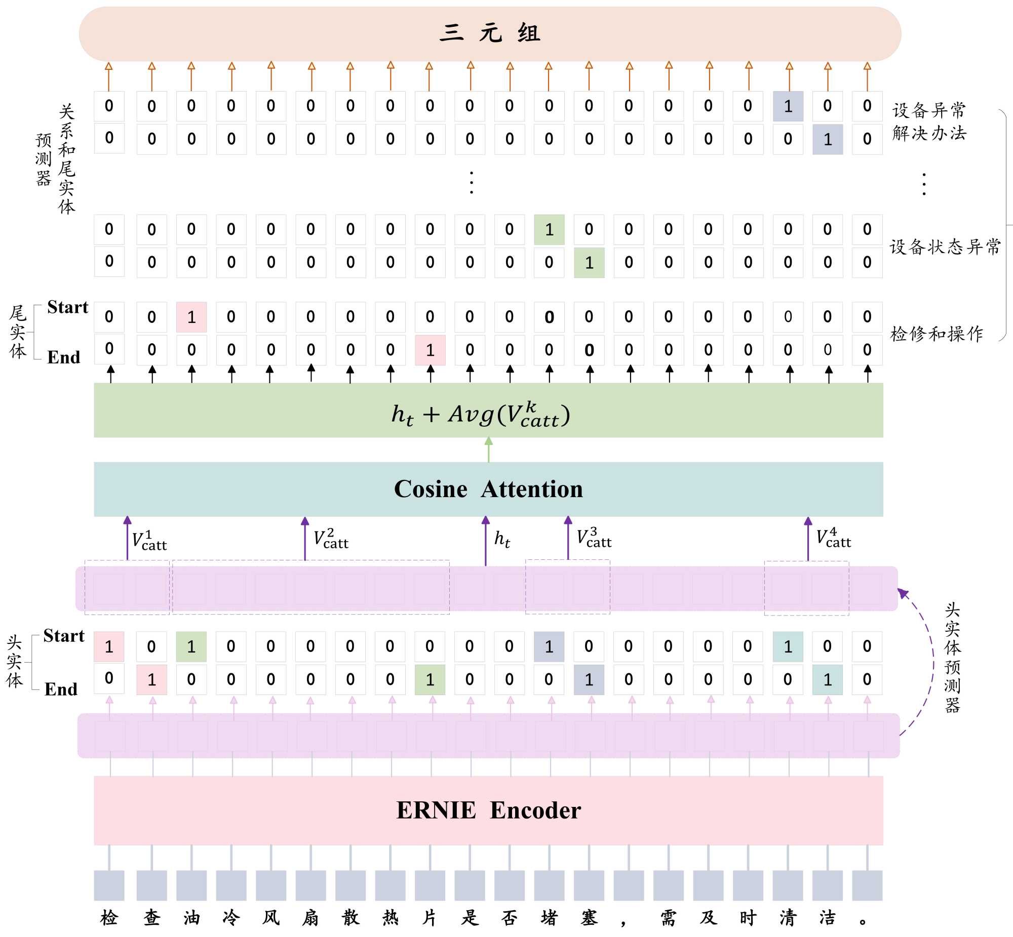 针对上述问题,本文以风力发电机故障领域为背景,构建了该领域内数据集,同时以CasRel模型为基准进行改进,本研究具体贡献如下:① 构建风力发电机故障领域实体关系抽取数据,共定义7类实体和10类关系,人工标注大约1000条数据。② 在词嵌入编码层引入ERNIE模型替代BERT模型,ERNIE模型融入知识图谱的信息,能够更有效地把握实体与实体之间的关联。③ 本研究在预测头实体之后,对头实体向量用余弦注意力机制进行编码,由于余弦注意力具有方向敏感性和语义纯度强化,可深层次地去捕捉语义的细粒度信息,一定程度上提升了模型的预测效果。