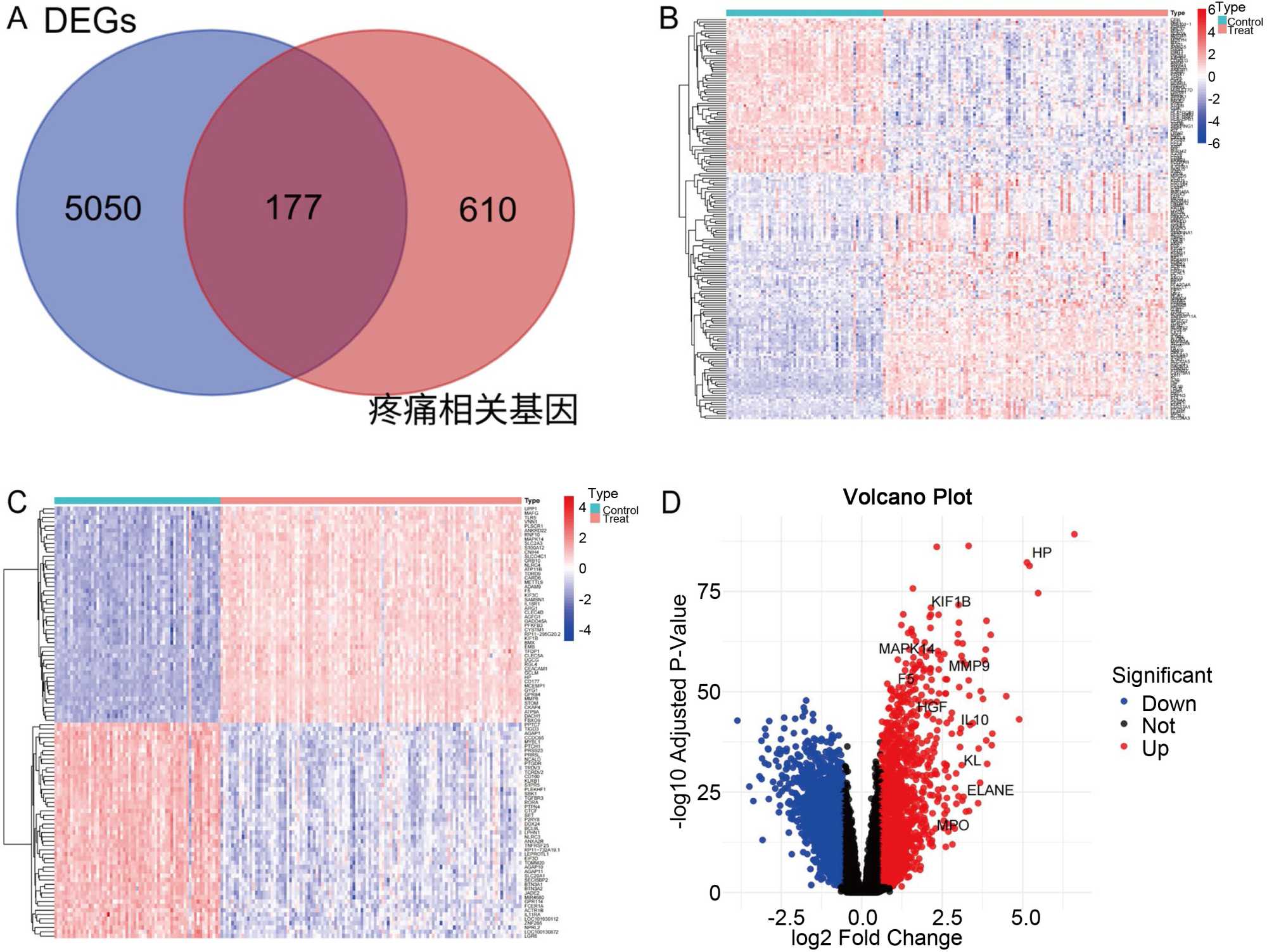 图1. (A) GSE19743数据集中差异表达基因 (DEGs)与GeneCards数据库中疼痛相关基因的交集;(B) 来自GSE19743数据集差异分析的DEGs热图;(C) 来自差异表达的烧伤疼痛相关基因的热图;(D) 差异表达的疼痛相关基因的火山图
