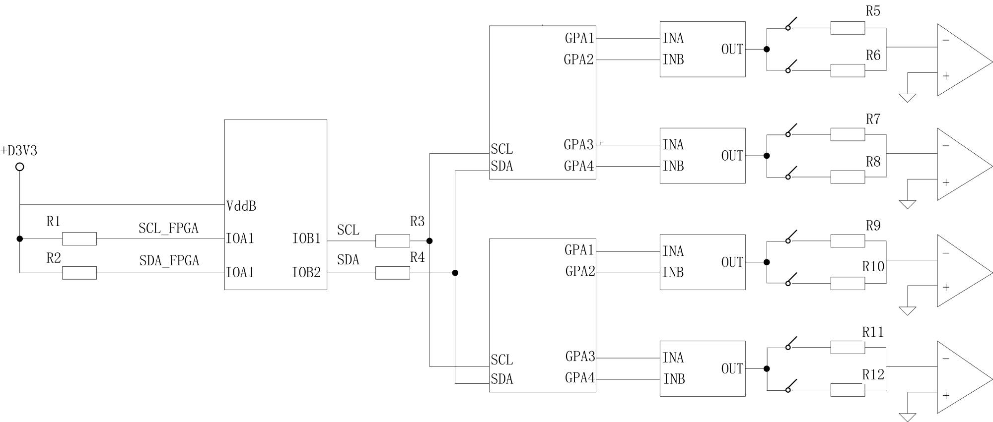 本文构建了一种高度可编程的程控放大电路系统如图3所示,旨在实现对输入信号进行精准且可变的放大处理。本设计采用了ADI公司出品的MAX14933芯片,该芯片作为一款先进的双通道、2.75 kV RMS耐受能力的IIC数字隔离器,不仅拥有高达1.7 MHz的数据传输速率,还凭借其卓越的隔离技术,确保了跨不同电源域信号传输的完整性与安全性。MAX14933通过其I/OA1与I/OA2引脚,遵循IIC通信协议,有效接收来自FPGA的精细控制指令。这些指令随后通过MAX14933的I/OB1与I/OB2引脚,被传输至两块MCP23017 I/O扩展器。MCP23017作为一款16位高性能I/O扩展器,极大地增强了IIC总线的并行处理能力,通过其丰富的I/O端口直接控制继电器阵列。