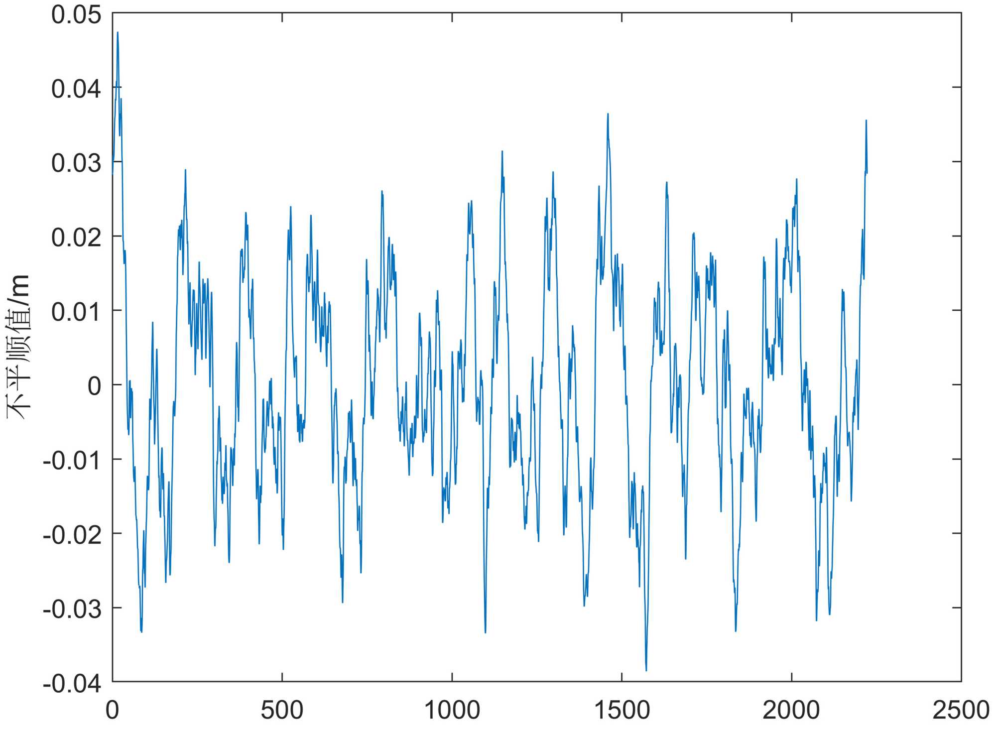 本研究采用MATLAB编程实现了路面不平顺谱的模拟,基于标准的功率谱密度(PSD)函数,生成了路面随机激励信号。程序根据给定的车速、波长区间和路面谱特征参数,首先在频域内构建指定波段范围内的不平顺功率谱密度曲线;然后,为了得到时域的随机路面不平顺信号,引入随机相位并执行反傅里叶变换(IFFT)。随机相位的生成首先需要随机生成一个介于0和2 π之间的数值,这个值代表了每个频率点的相位,这个相位是从均匀分布中随机选取的。接着,通过余弦和正弦函数将生成的相位转化为复数形式,复数的实部是相位的余弦值,虚部是相位的正弦值。最后,将这个复数形式的相位与对应频率点的振幅进行相乘,得到包含振幅和相位信息的复数谱。同时,利用频谱分析方法(Welch法)对生成的时域信号进行验证,与理论谱进行对比分析,以确保仿真结果的准确性和可靠性。最终输出了路面不平顺的位移信号和相应的速度信号,为后续车辆振动响应分析提供输入基础。生成的轨道高低不平顺和水平不平顺如图5和图6所示。