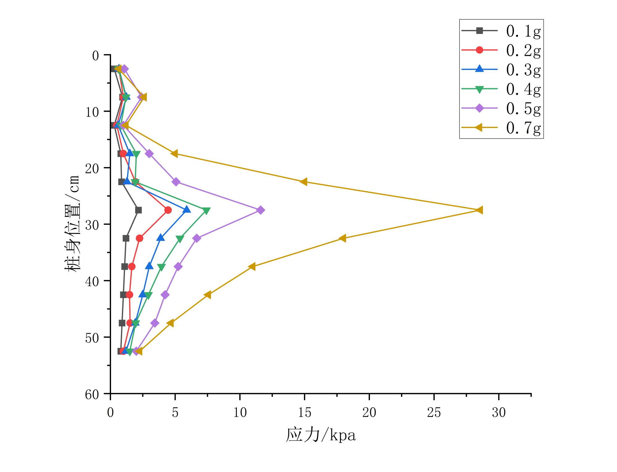 悬臂段各加速度峰值地震力作用下的土压力从0.94 kpa增至2.61 kpa,较0.1 g状态下土动压力增加至106.38%~277.66%;在桩身25 cm~35 cm处动土压力达到最大,从各加速度峰值地震力作用下的土压力从2.16 kpa增至28.57 kpa,较0.1 g状态下土动压力增加48.5%~1322.68%。