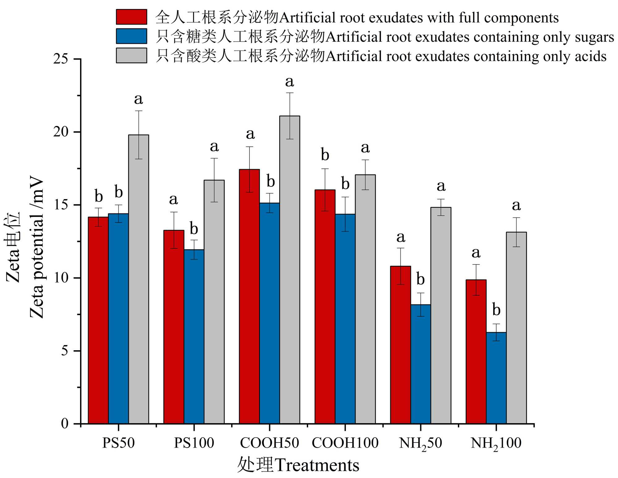 图6. 三种PSNPs颗粒在不同成分人工根系分泌物处理后平均水合粒径大小(a)及Zeta电位绝对值(b)
