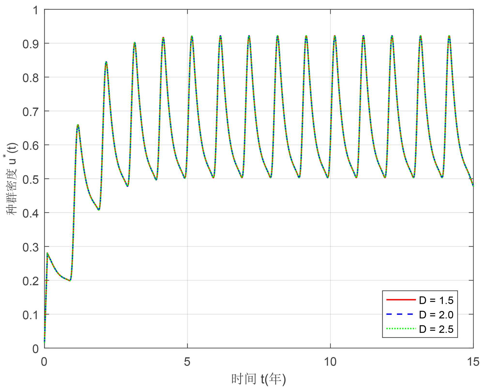 。图2展示了系统(1)的时空演化过程。可以清楚地看到,种群在经历短暂过渡期后,从第4年开始形成稳定的空间梯度分布,这标志着种群已达到动态平衡状态,并表现出明显的年周期性振荡特征。从行波传播理论的角度来说,一个以大于传播速度向左或向右移动的观察者最终会看到以初始条件