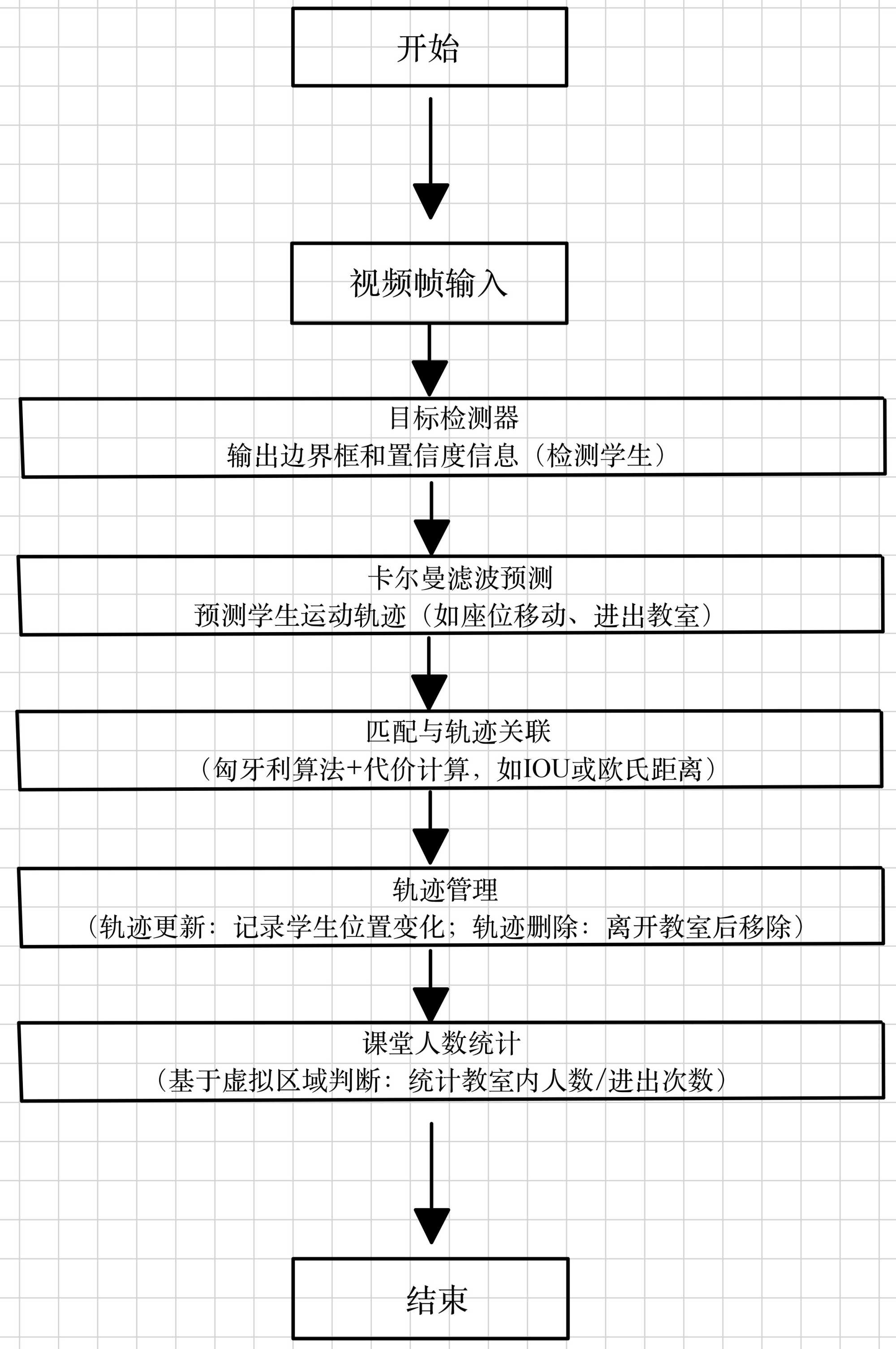 SORT (Simple Online and Realtime Tracking)算法通过卡尔曼滤波[6]预测目标的位置变化,结合匈牙利算法[7]解决检测结果与上一帧跟踪状态之间的关联问题。SORT通过建立目标的动态状态模型(如位置和速度),在短时丢失检测的情况下能够保持跟踪的连续性。此外,通过设定匹配阈值,SORT在空间上对检测结果进行优化,确保跟踪ID的一致性,避免目标在多帧间因遮挡或检测误差导致ID频繁变化。最终,算法综合YOLOv8的检测结果和SORT的跟踪能力,对目标在视频中的动态状态进行精确建模,并为每个目标分配唯一的跟踪标识符,实现检测和跟踪的高效融合。这种结合方法既保证了检测的精度,又提升了在动态场景中的跟踪稳定性,是一种适合实时目标检测与跟踪的高效算法解决方案,在教室人数图像识别项目中,通过融合多张图片(如连续视频帧或多视角图像)的时空信息可显著提升遮挡场景下的识别效果。技术实现可分为三个层次:首先基于YOLOv8或DETR等深度学习模型完成单帧目标检测,通过自注意力机制强化遮挡区域的局部特征提取;其次引入DeepSORT多目标跟踪算法[8],利用卡尔曼滤波预测遮挡目标的运动轨迹,结合ReID特征跨帧匹配实现身份连续性保持;最后采用多视角立体视觉技术,通过张正友标定法[9]实现多相机参数标定,运用三维点云重建消除单视角盲区。通过在滤波等方面对YOLOv8算法进行改进,可以显著提高算法的性能和效果。在一些公开的数据集上进行实验表明,改进后的算法在小目标检测精度、定位精度和对新类别的泛化能力等方面都有了明显的提升。