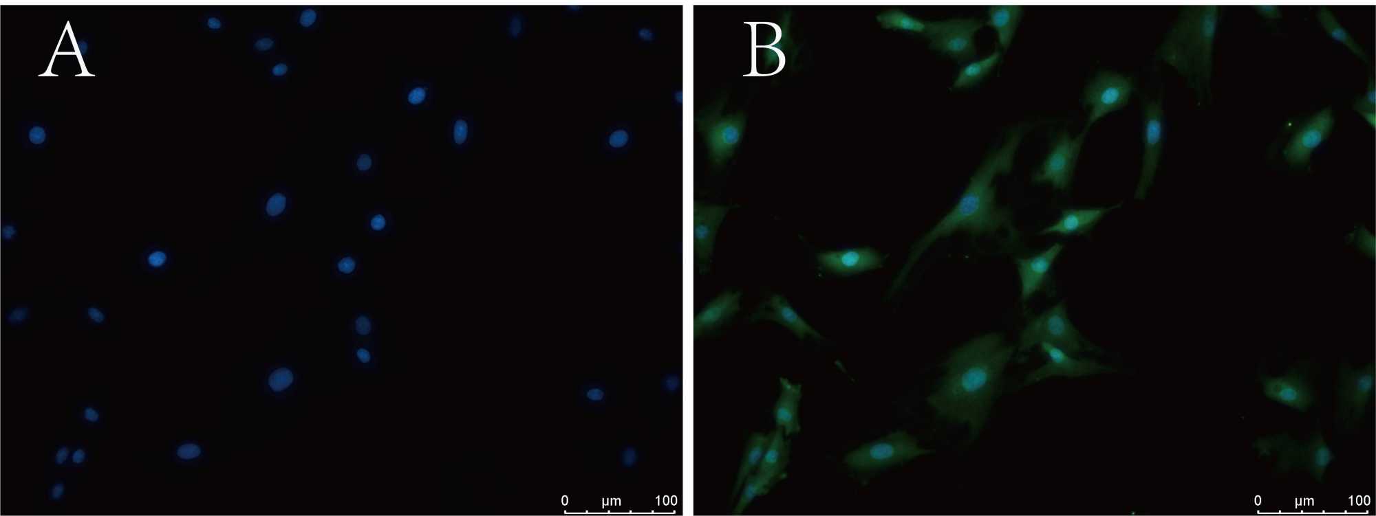 将HPF细胞接种于12孔板中,HPF细胞密度达到80%左右时,弃培养基且PBS浸洗后用4%多聚甲醛室温固定细胞、0.5%曲拉通X-100室温通透、封闭1 h后加入5% BSA稀释的山羊抗兔抗体(1:200)、5% BSA稀释的山羊抗兔抗体(1:200),4℃培养过夜。第二天加入用5% BSA稀释的Alexa Fluor 488标记山羊抗鼠IgG二抗(1:200),避光孵育1 h。再加入DAPI (DAPI Staining Solution)避光孵育10 min。最后PBS浸洗,调试荧光显微镜发射波长为488 nm时,观察蛋白的表达情况。