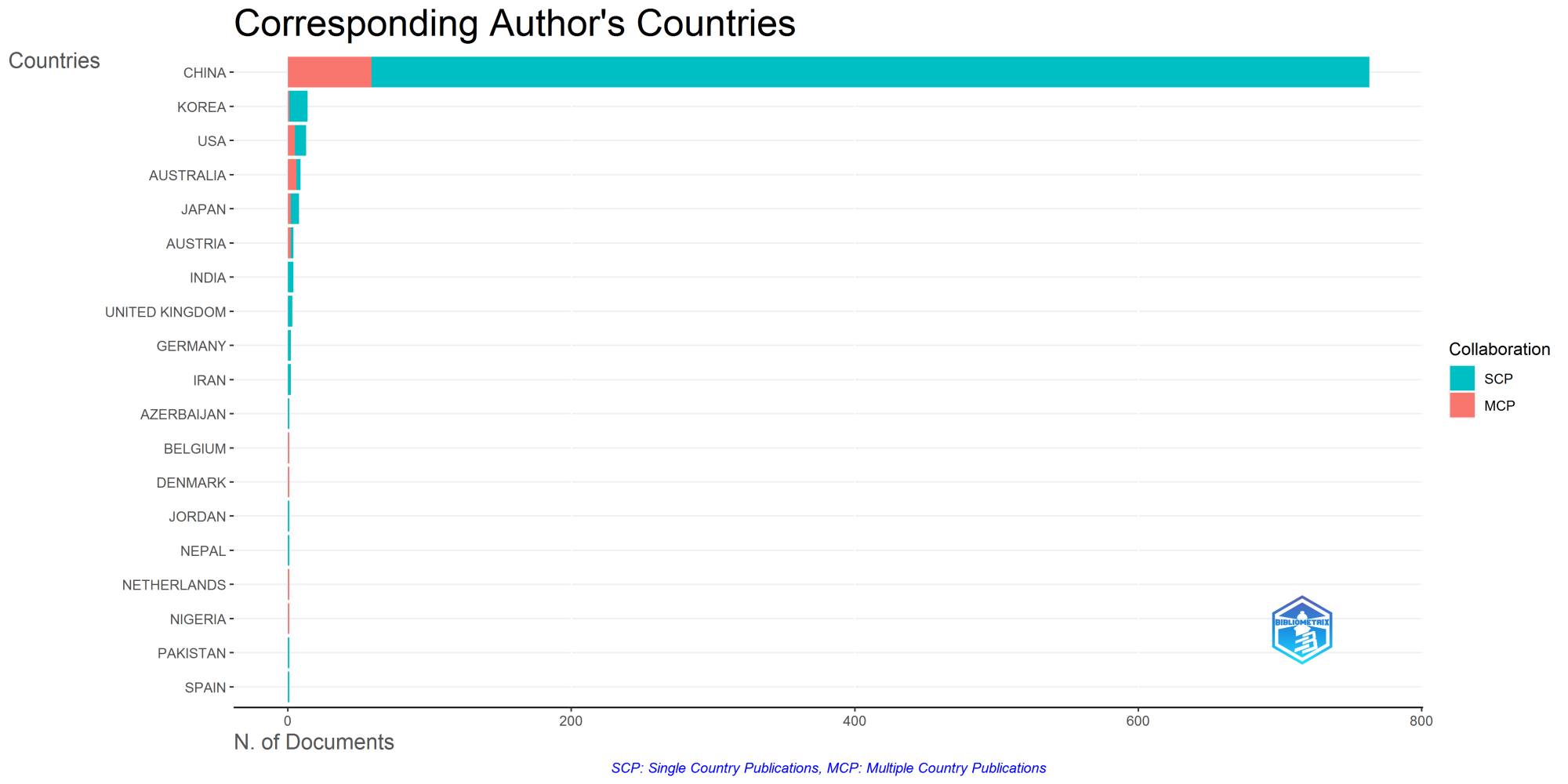 图2呈现了以第一作者所在国家作为文献的发表国家进行统计分析。结果显示,共有20个国家涉及发表本领域相关文献。其中发文量最多的研究机构为中国,共发文763篇,文献发表量前10位的研究机构分布情况见图2。