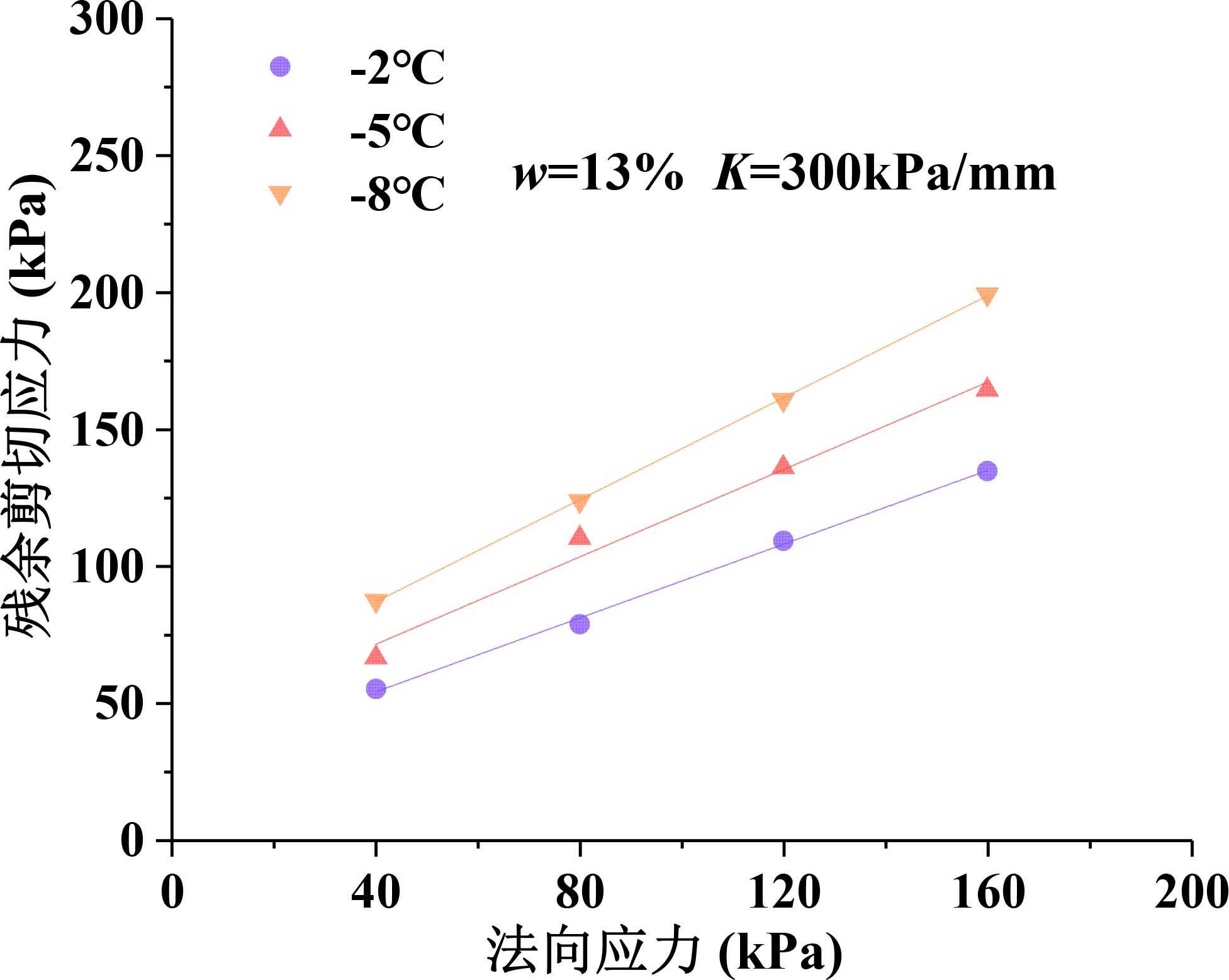 在常温条件下,不同初始法向应力状态下,材料表现出应变硬化的特征;而在负温条件下,材料则呈现应变软化的趋势。随着初始法向应力的增加,剪切强度显著提升。刚度对界面剪切应力的影响相对较小,但在常温和负温下,界面剪切应力均随法向刚度的增加而增大。常温下,界面剪切强度在土样含水率为13%时达到最大值;而在负温条件下,含水率越高,界面剪切强度越大,且随着温度的降低,剪切强度逐渐增加。