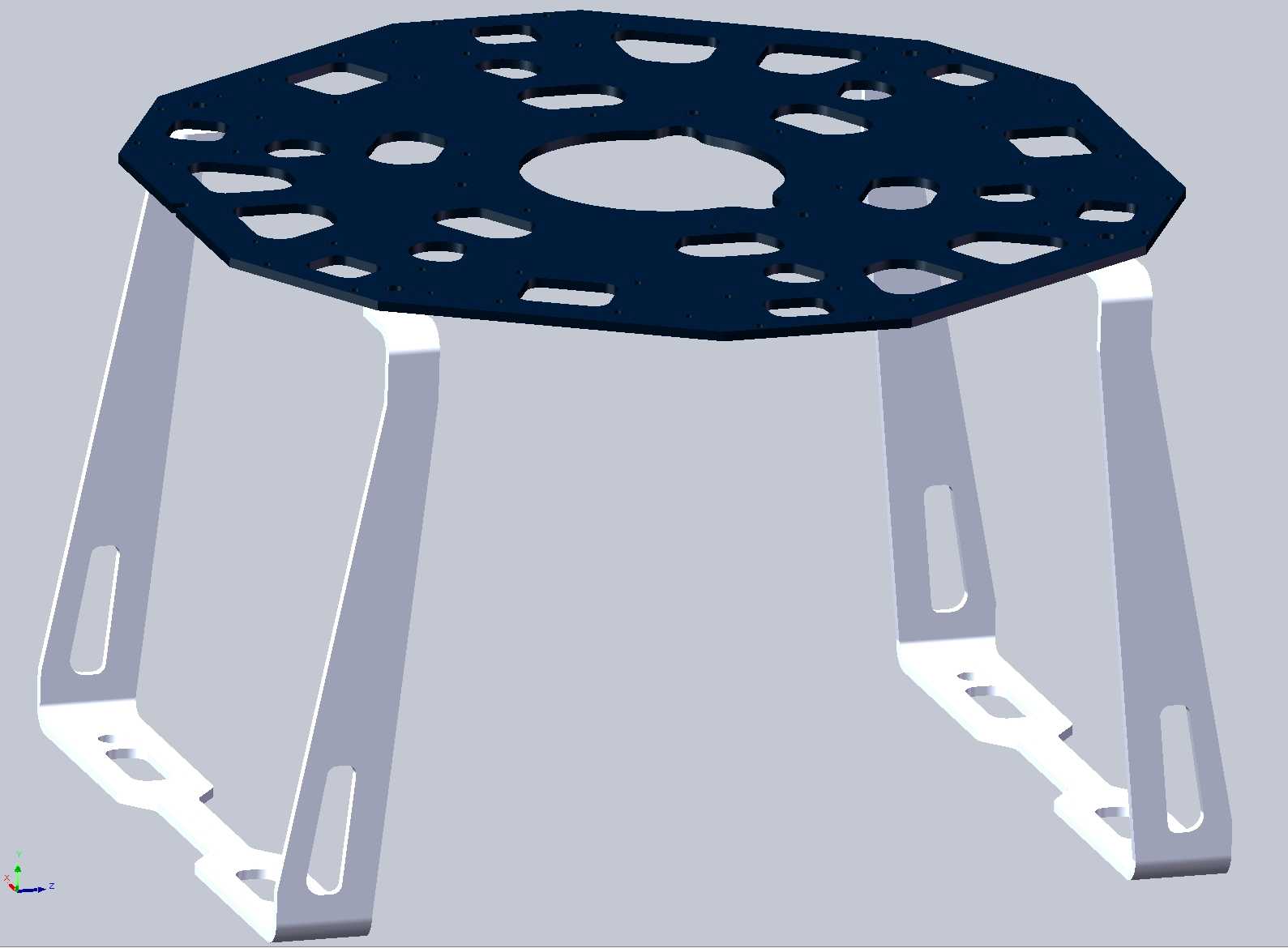 在本设计中,对于六旋翼无人机有多用途需求,可以根据飞行任务需要,更改无人机挂载组件,实现多任务的飞行情况。对于这种挂载组件与无人机,需要一个多用途的支架让任务挂载组件与无人机固定,保证两者的固定连接,整体无人机结构如图1。多用途挂载结构需要拥有多个安装孔径,保证多类型的挂载组件安装稳定,并且采用7075铝合金进行设计,中心碳纤维板与挂载结构安装如图2。