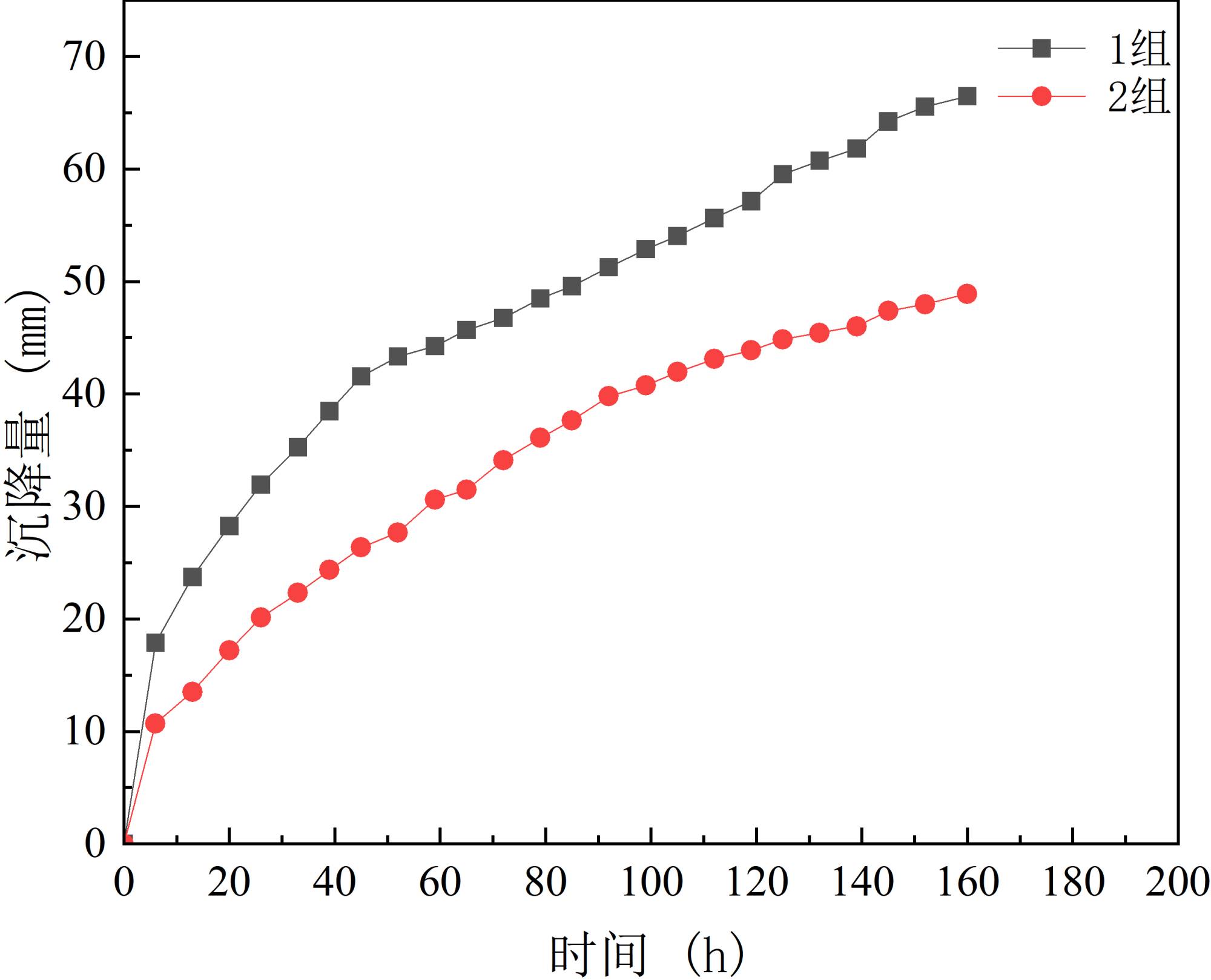 图6. 试验组1、2中部沉降对比图