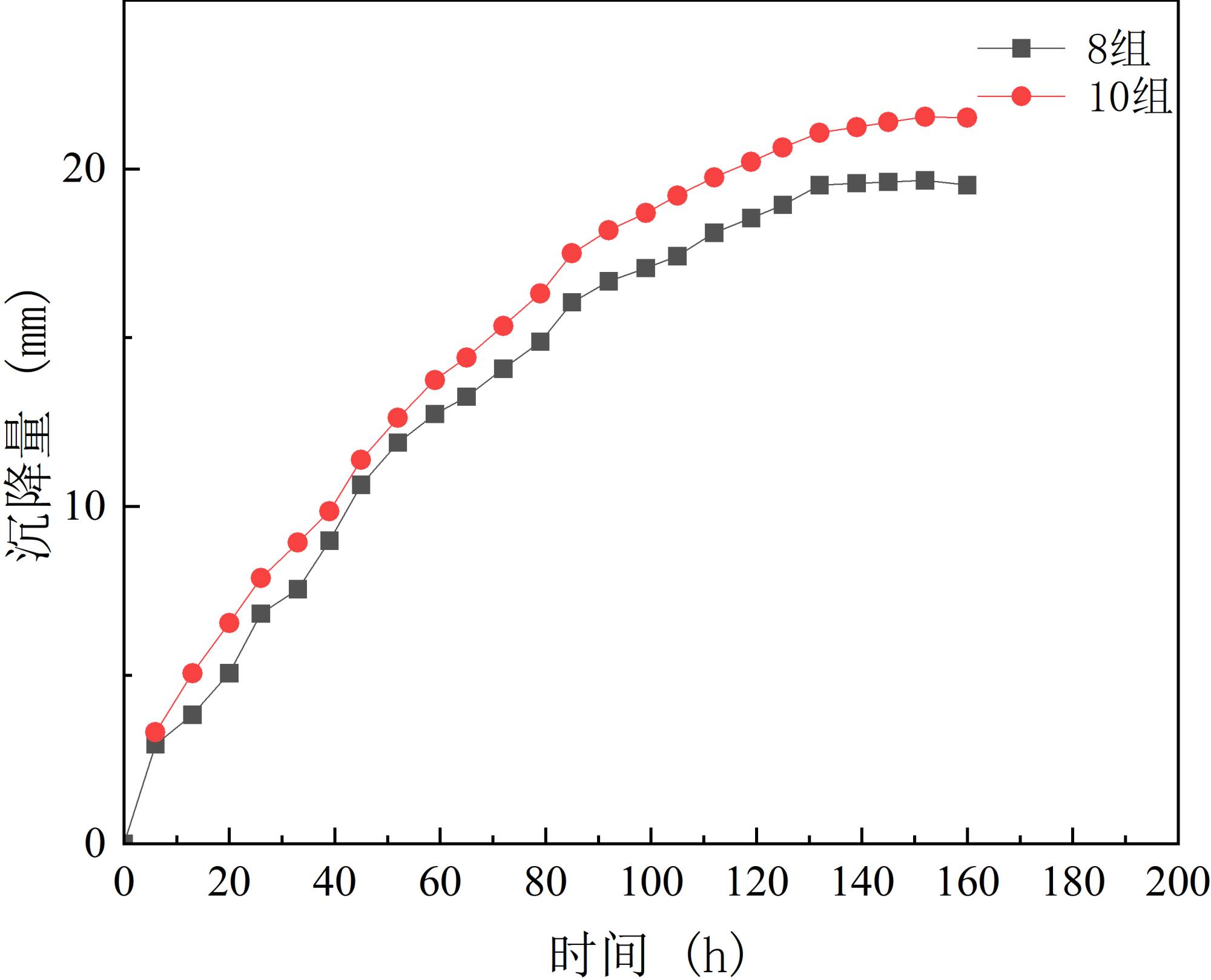 图9. 试验组8、10中部沉降对比图
