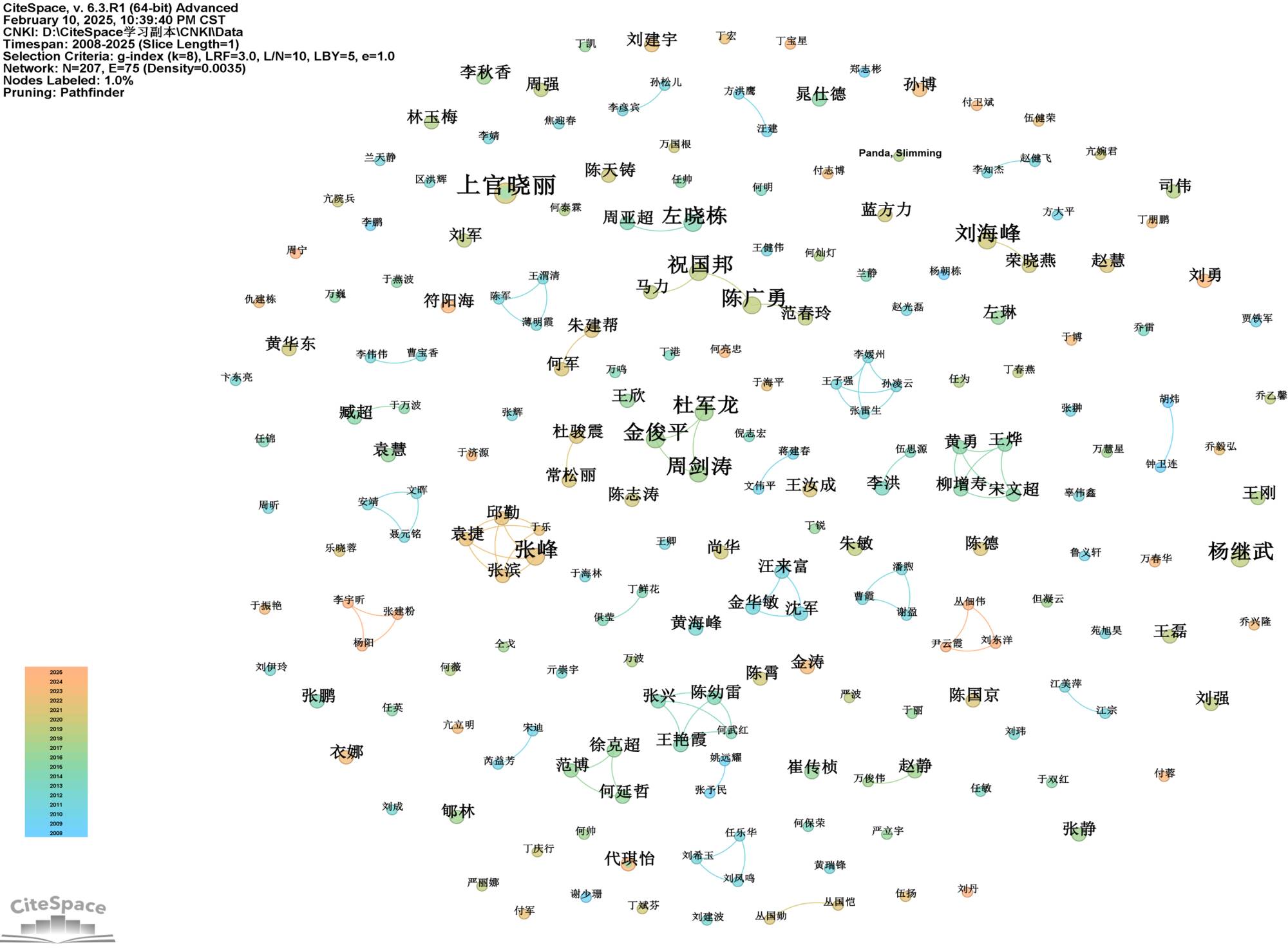 对2057篇有效文献的发文作者进行可视化分析(图2),图中共有207个节点,75根连线,网络密度为0.0035,其中,节点代表作者的发文量,节点越大,说明发文越多,连线则表示作者间存在合作。从发文量上看,上官晓丽发文4篇,杜军龙、陈广勇、周剑涛、祝国邦、左晓栋、刘海峰、杨继武、金俊平、张峰等人发文3篇,其他学者发文为1~2篇。根据普赖斯定律中核心作者公式计算得出M = 1.498,即说明在该领域发文量达到2篇及2篇以上的作者是核心作者,因此得出该领域的核心作者共有72人。从合作研究上看,图谱中的连线并不多,存在小规模集中分布的情况,即发文者之间大多数是独立研究。