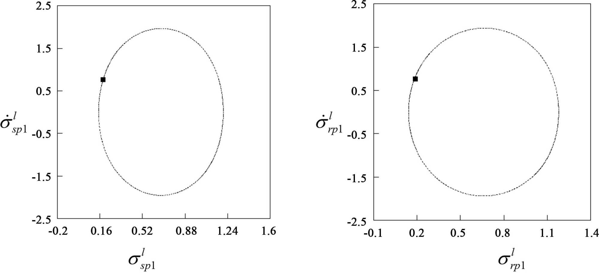 的增加,内外啮合由1T运动进入到概周期1运动,在Poincaré周期截面上形成一个吸引的不变环,图4(b)描述了其周期运动的相图、Poincaré映射图,啮合冲击状态为1;增加 ,内外啮合进入2T运动,啮合冲击状态为1,图4(c)描述了其周期运动的相图和Poincaré映射图叠加图;继续增加