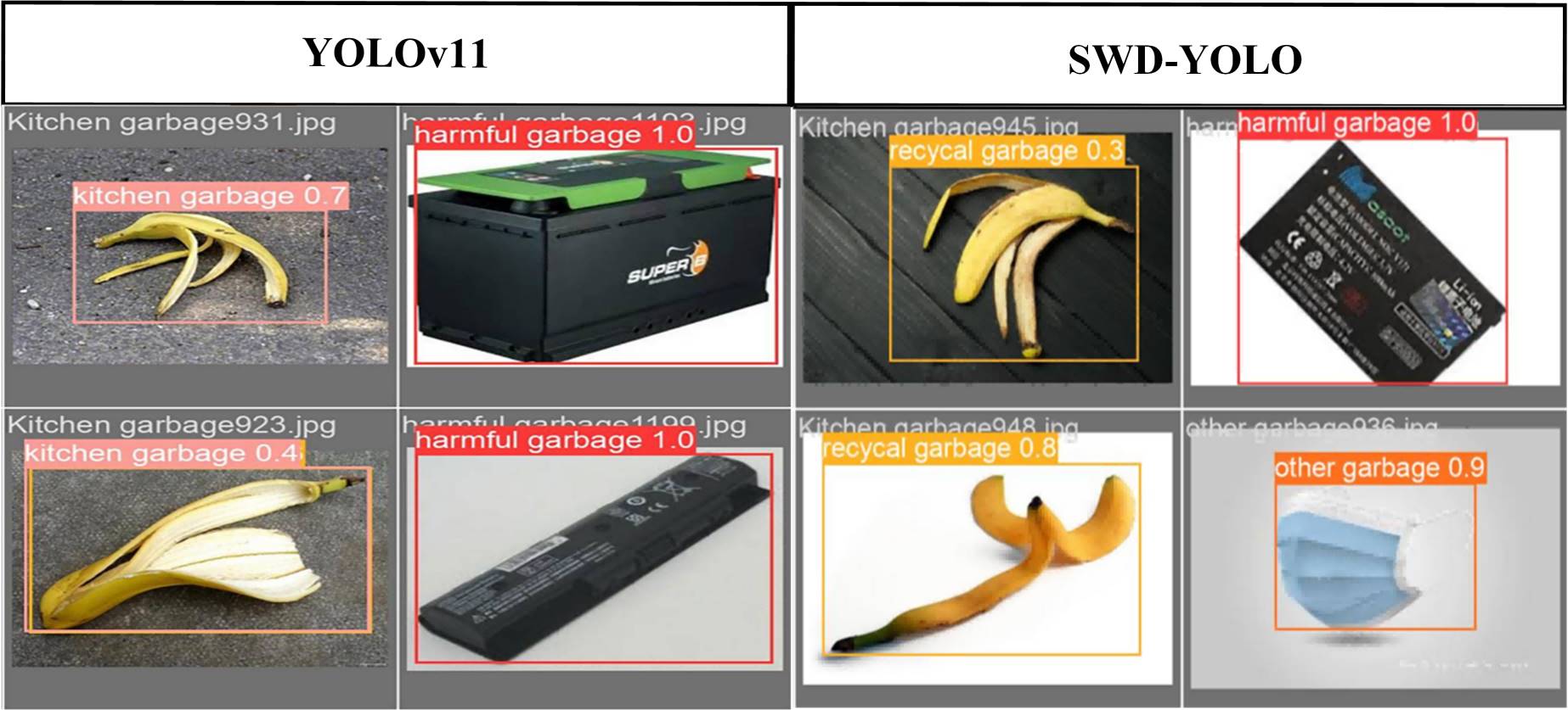 通过各类生活垃圾评价指标的详细对比实验,不难发现本实验采用三次模块融合改进,在每一类生活垃圾的平均精度(mAP@50),精度(P)和查全率(R)一系列评价指标上都有着显著的改进成果。因此,本文提出的轻量级高精度的SWD-YOLO生活垃圾分类模型适用于垃圾分类任务。