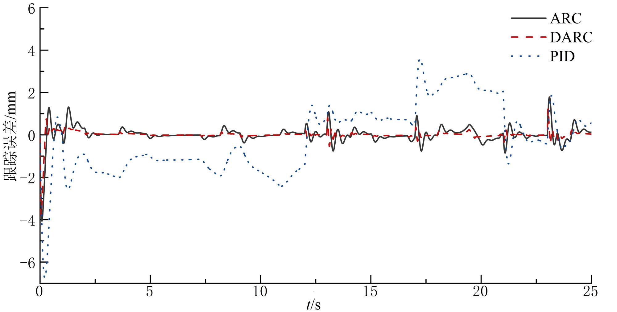 为验证文中所提基于扩展状态观测器的自适应鲁棒控制器(DARC)的有效性,分别和自适应鲁棒(ARC)和PID控制器进行对比。选择3个控制器各自表现较好的参数。其中:DARC参数为: