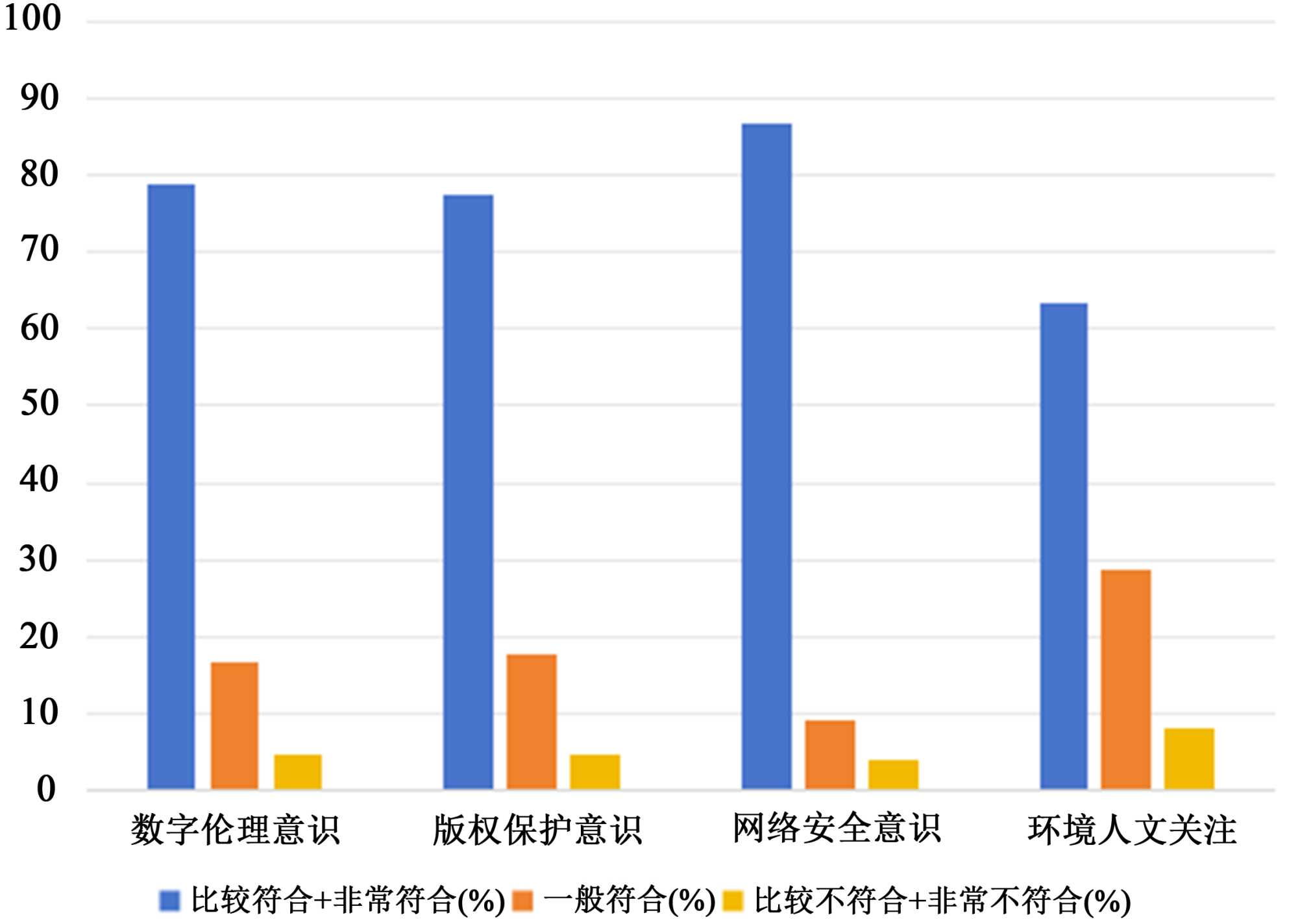 在数字伦理与安全意识状况层面上,大学生整体表现较好。多数学生能遵循数字社会的网络礼节以及明确价值观念和行为准则。在规范使用网络内容和保护数字版权方面大部分学生表现比较符合或非常符合。在互联网安全意识上半数学生能很好地保护个人数据和隐私,同时不少学生也关注信息技术带来的环境和人文问题,体现出大学生较高的社会责任感和安全防范意识。(见图4)