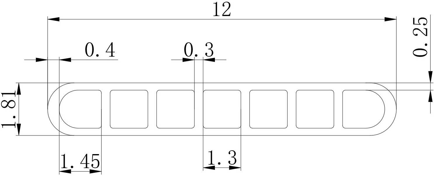 所研究的微通道铝扁管在使用过程中孔内充有冷却介质,用作汽车冷凝系统中的流体导管。为提高其导热率,铝扁管常被设计成薄壁多孔。本文所研究扁管孔数为7孔,孔间筋厚和边缘壁厚分别为0.3 mm和0.25 mm,其横截面如图1所示。