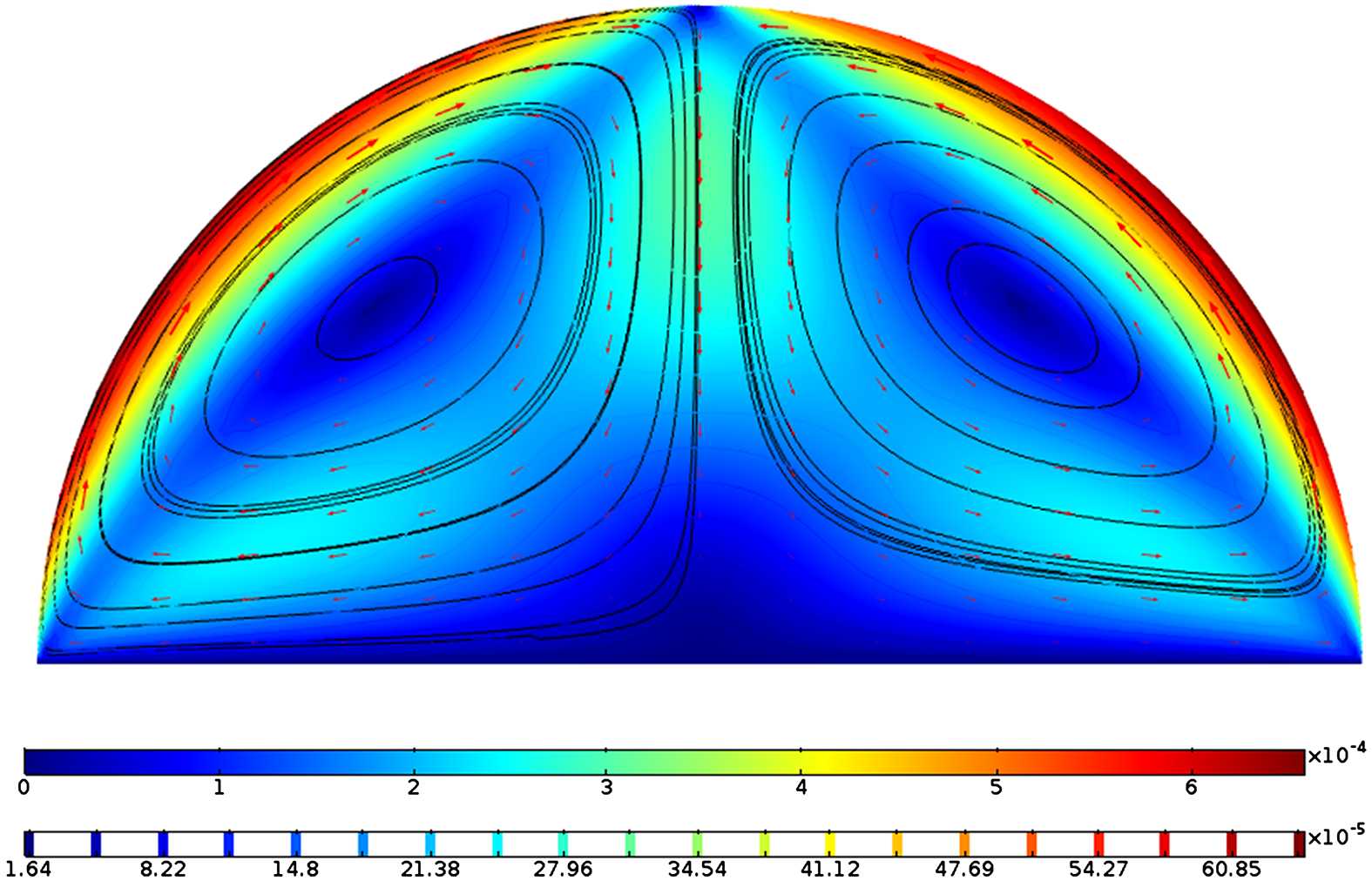 图6给出了基于模型的硅油流体的二维液滴的表面速度大小和速度分布,温差为6.85 K。重力加速度为−9.8 m/s2,液滴半径为0.01 m的情况。液滴内部均存在对称且流向相反的涡流场,表明不同对流形式下,液滴内部始终存在对称涡流,使得液滴自身散热达到最大程度。纯浮力对流下,液滴内部流体高速区较多,尤其在液滴中间处存在明显的较高速区,且液滴表面的较高速度区域较小。浮力对流+热毛细对流时,液滴上表面边沿的流体流动高速区明显增加,其内部较高速区域显著减少,液滴内部流动速度普遍均一。并且在比较了液滴区域的流速情况后,发现存在热毛细对流时,液滴内部和边沿的流速,无论是整体的情况,还是速度最值均有明显的增加。