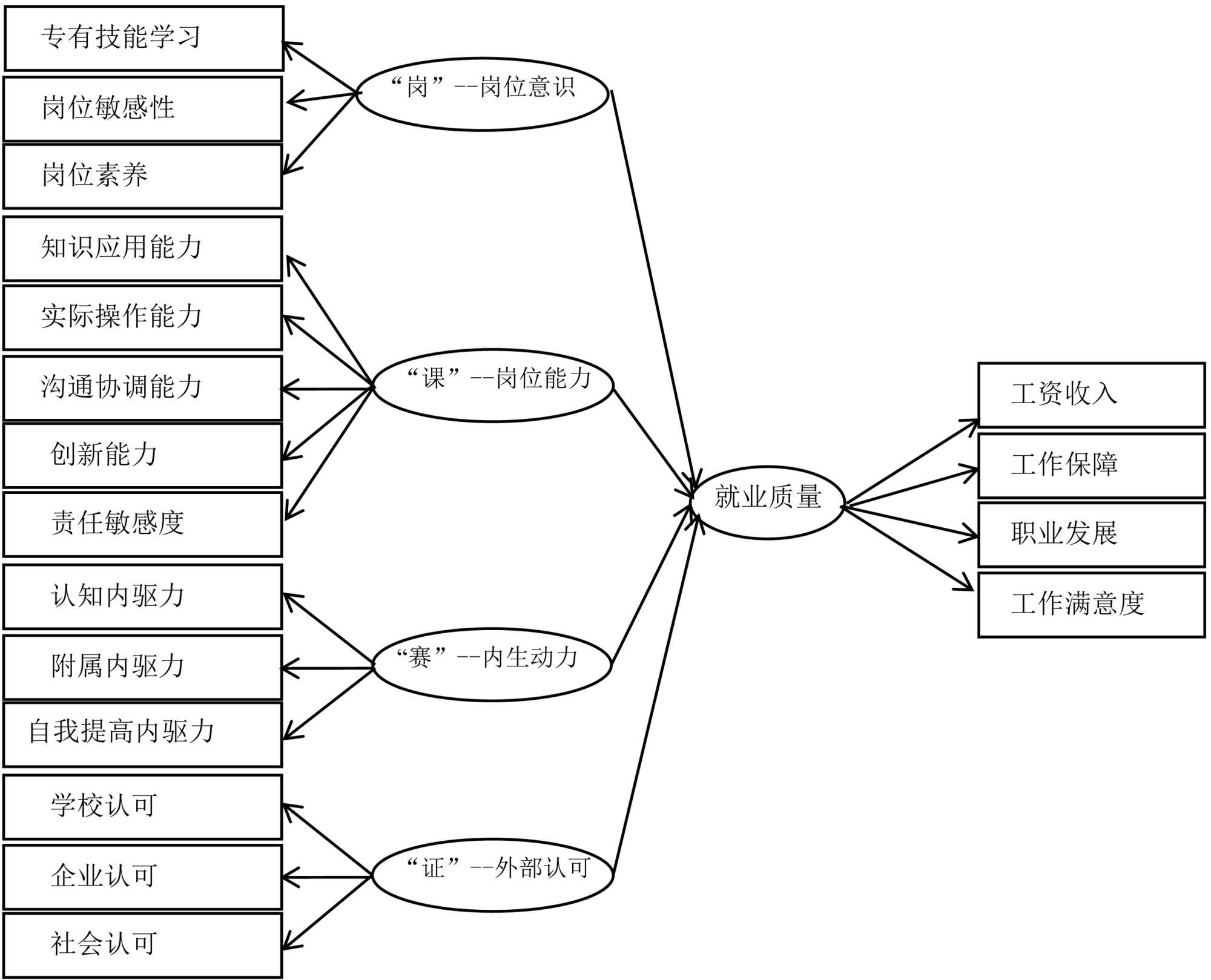 “岗课融通”对就业质量的影响,陈琴珍在“岗课赛证创”高质量人才培养模式中,提出以具体岗位为起点,将教学方案岗位化,为学校理清人才培养方向,为学生提升岗位意识,从而促进学生的就业质量[8]。“课程融通”对就业质量的影响,李琳以“岗课赛证”融通为导向,进行课程改革,改变《软件测试技术》等课程当前重理论知识、案例陈旧过时与实际岗位需求脱节等问题,结合自动化测试工程师、功能测试工程师等具体岗位,提高学生实操能力,提升了学生的就业质量[9]。“课赛融通”对就业质量的影响,“岗课赛证”融通具有增进高技能人才培养作用,其中比赛具有竞技性,借助竞赛可以构建新的学习激励机制,该机制赋能学生提高学生主动性,对学生就业质量起到了促进作用[10]。“课证融通”对就业质量的影响,“岗课赛证”融通模式下,执行“赛领证评”多主体多维度评价方式,1 + X证书实质是借助市场机制建立起来的外部考评机制,为行业相关企业人才聘用决策制定提供依据,于证书参与主体而言,是一种获得外部认可路径[11]。以2022年高职毕业生就业数据为样本,探讨技能竞赛对高职学生初入职的就业质量影响[12]。就业质量作为评价性指标,是就业者主观感知与客观表现的结合[13]。就业质量与教学质量同属职业院校质量评估体系,两者之间存在相互促进作用[14]。