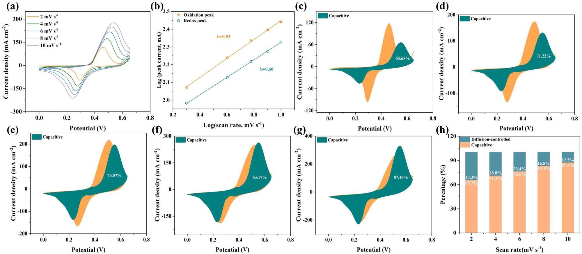 Figure 6. (a) CV curves at different scan rates, (b) Linear relationship between scan rate and peak anode current, (c)~(g) Capacitance contribution ratio at different scan rates (2, 4, 6, 8, 10 mV∙s−1), (h) Percentage capacity contribution at different scan rates for Cu1.8Se@NiMn-LDH@CoSe2 electrode