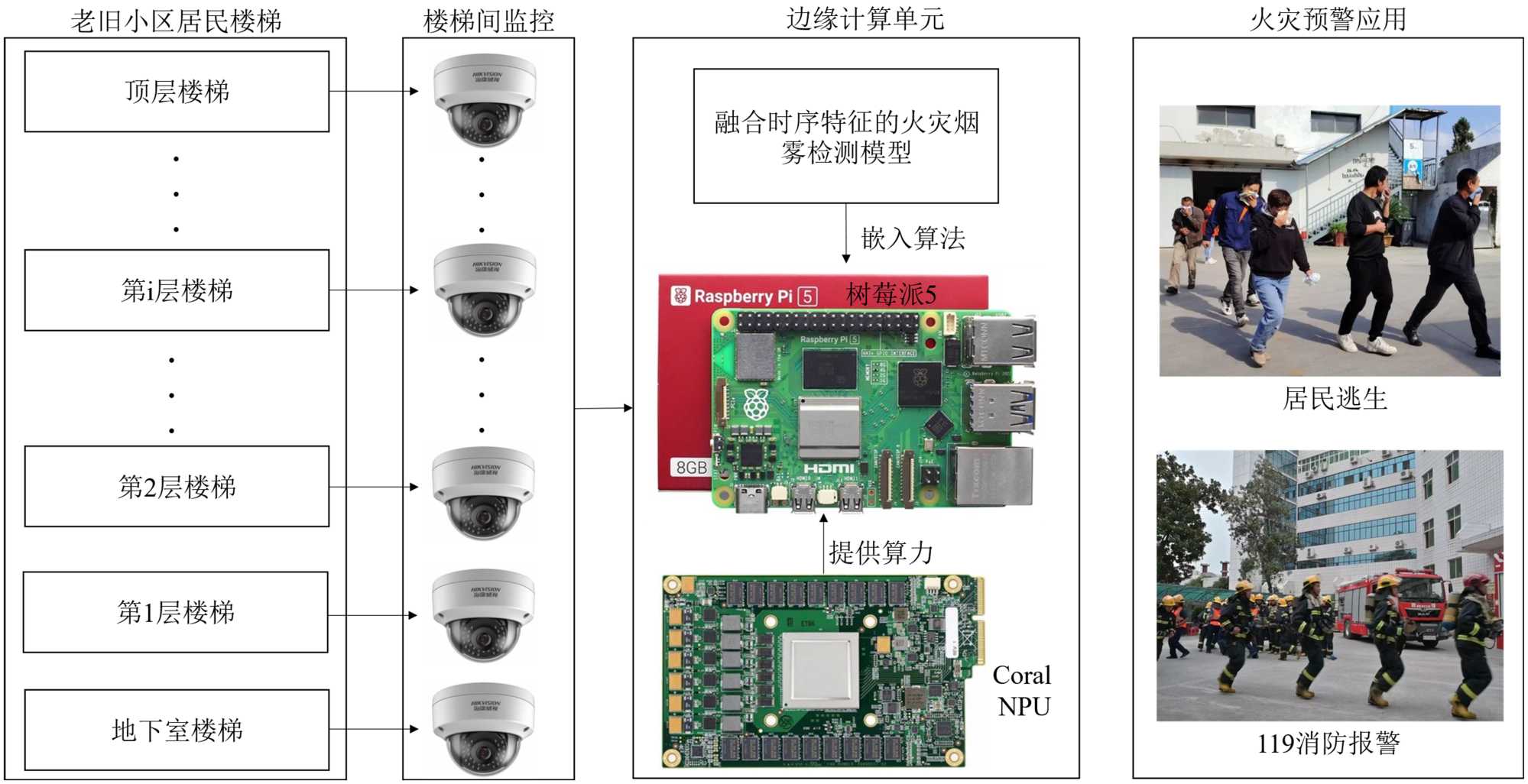 为适应老旧小区既有监控体系,将树莓派5与Coral NPU模块集成于一个紧凑型外壳内,通过USB3.0接口连接至老旧居民社区楼道中的CVBS/RTSP网络摄像头。系统实时获取视频流,并在本地进行图像预处理、目标检测与火灾烟雾识别推理。通过火灾烟雾检测的程度不同,设计三级预警机制实现风险分级响应。整个预警系统支持PoE (Power over Ethernet)及独立PoE HAT模块供电,可通过4G/5G或社区WiFi实现远程维护与OTA模型升级。整个系统架构如图1所示。
