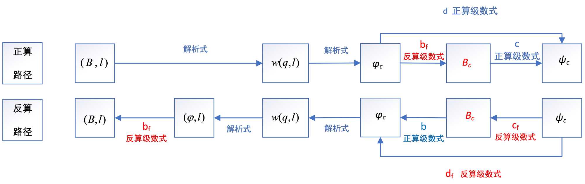 Figure 1. Non-iterative transformation path diagram of forward and backward calculation between geodetic longitude and latitude