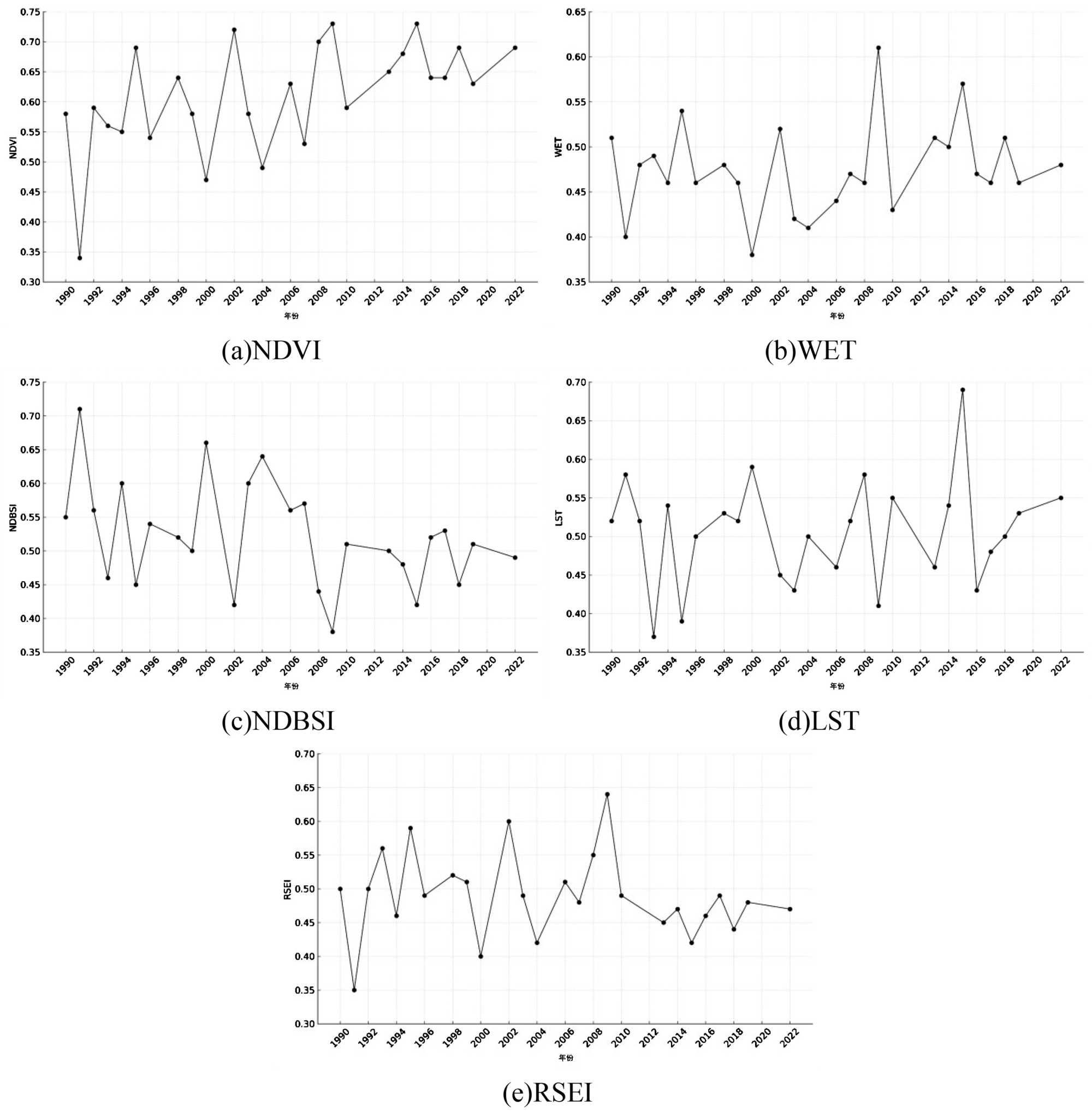 从表2中可知,第一主成分(PC1)的特征值始终占据主导地位,其贡献率均超过60%,最高达到81.38%,平均贡献率为72.67%,说明PC1能够代表生态环境的综合状况,且是构建RSEI的关键因子,验证了遥感生态指数在反映区域生态质量方面的科学性和稳定性。