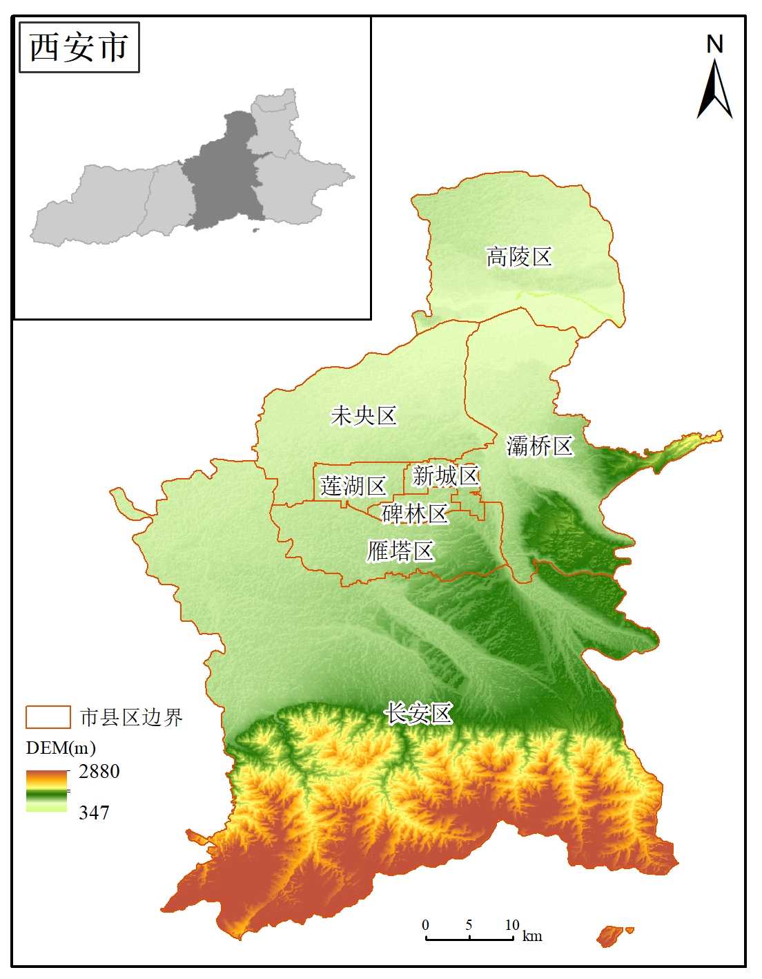 本文选取西安市七个区(新城区、碑林区、莲湖区、灞桥区、未央区、雁塔区和长安区)中提取的建成区作为主要研究区域(图1)。市中心区域(新城区、碑林区、莲湖区)建筑密集,商业活动频繁,交通发达,地表温度较高,是研究城市热岛效应的重要区域;而外围区域(灞桥区、未央区、雁塔区、长安区)的地表温度则随着城市化进程的推进而受到一定影响。例如,夏季气候炎热干燥,在建筑密集、道路宽阔且绿地稀少的城市中心热岛效应更明显。选择这七个具有代表性的区域,有助于全面揭示西安市城市热岛效应在不同季节的时空变化规律及其影响因素。通过系统分析这些区域的热环境特征,本文旨在为城市规划者提供科学依据,优化城市空间布局,增强城市绿肺功能,从而有效缓解热岛效应,促进城市的可持续发展与环境管理水平提升。