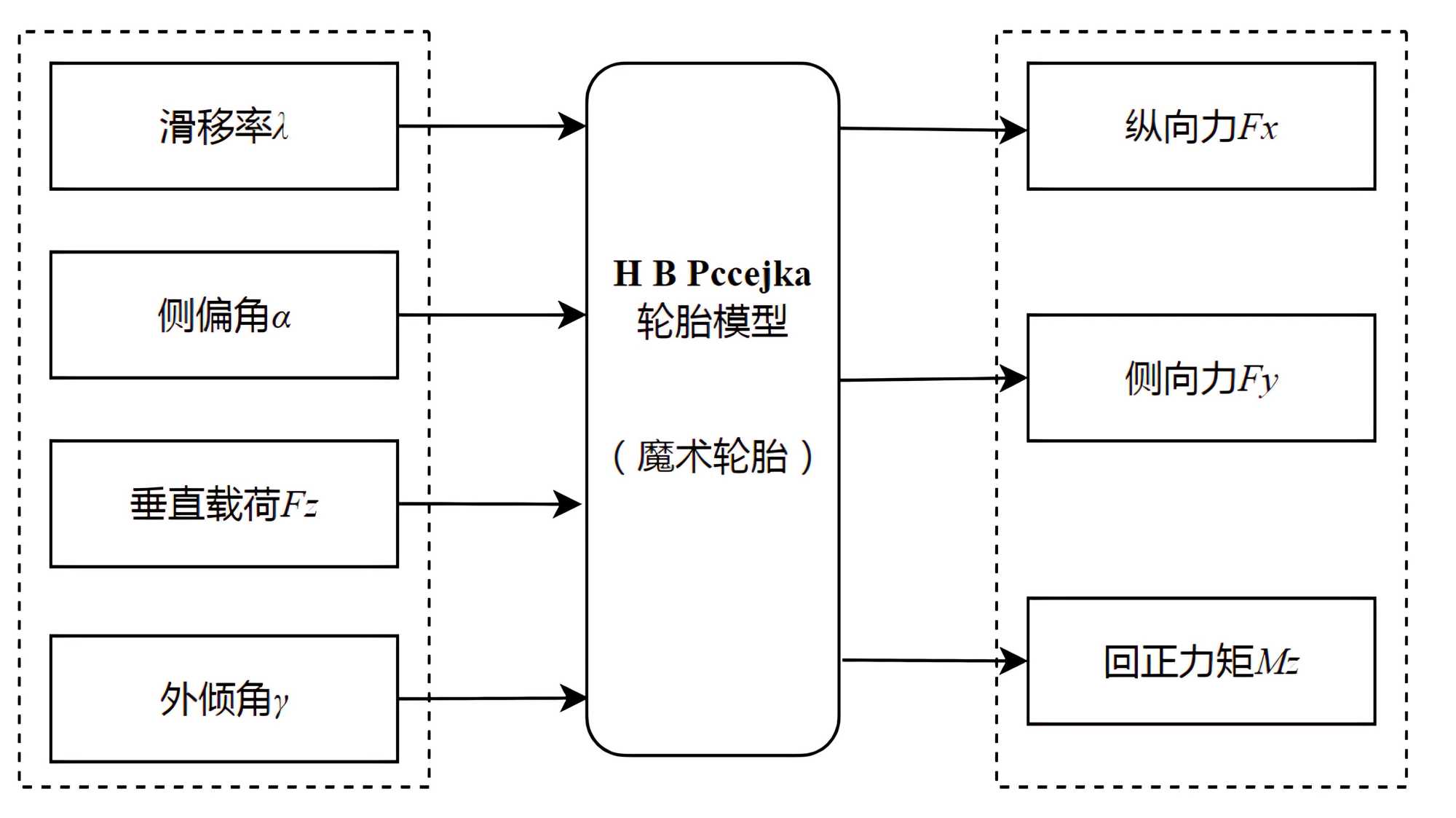 本文采用的魔术公式轮胎模型[8]具备良好的非线性力学行为刻画能力,同时结构简洁、使用便捷。魔术轮胎的输入输出如图2。