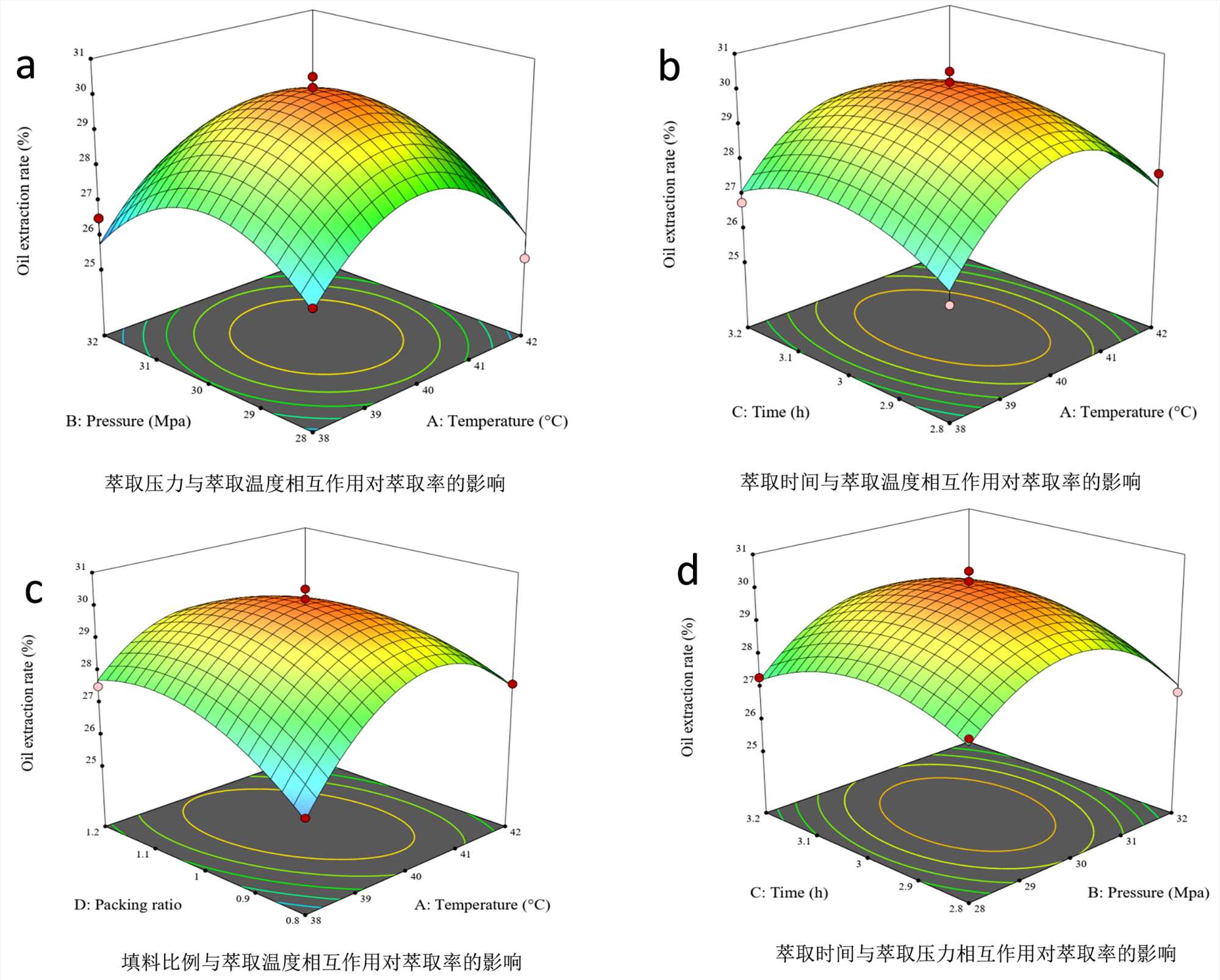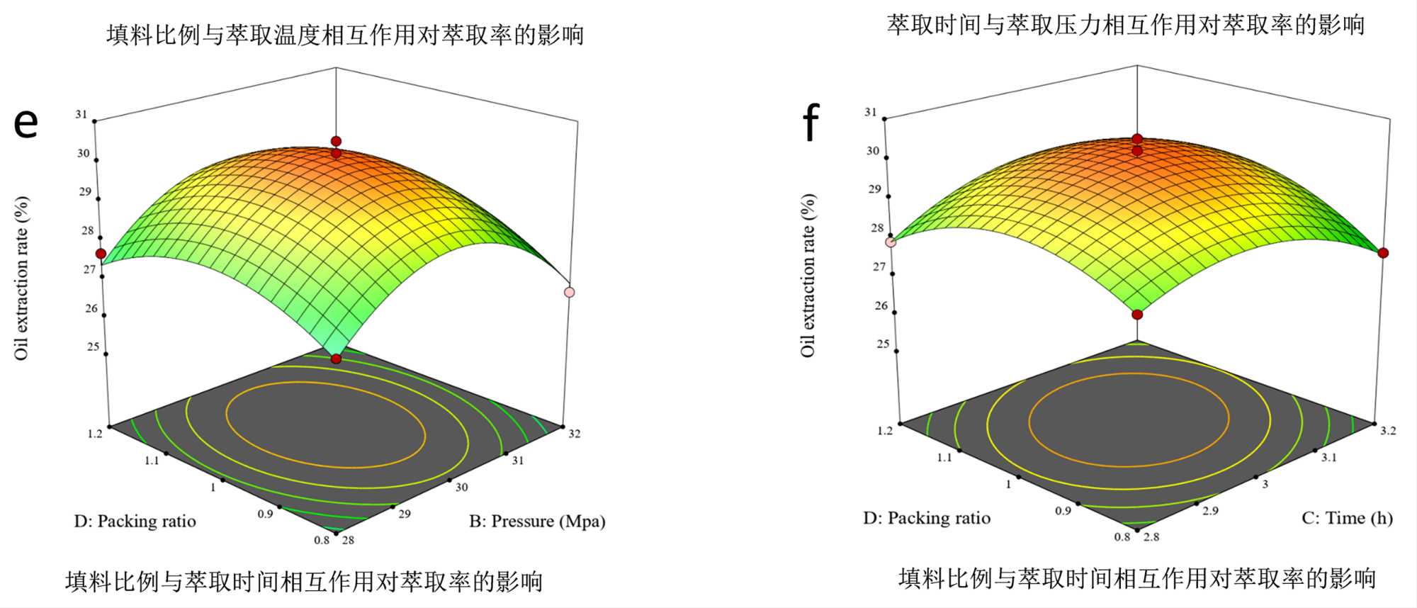 如图2(d)所示,在特定萃取时间下,油脂的提取率随着萃取压力增大而增加,而后出现平缓的趋势。但相比较萃取压力,提取率随着萃取时间变化没有很大明显变化,这表明萃取温度和填料比例存在的条件下,萃取压力对浓缩磷脂的油的提取率增加起到主要影响作用。但总体来看在萃取时间与萃取压力交互作用下,都能够促进提高油的提取率。