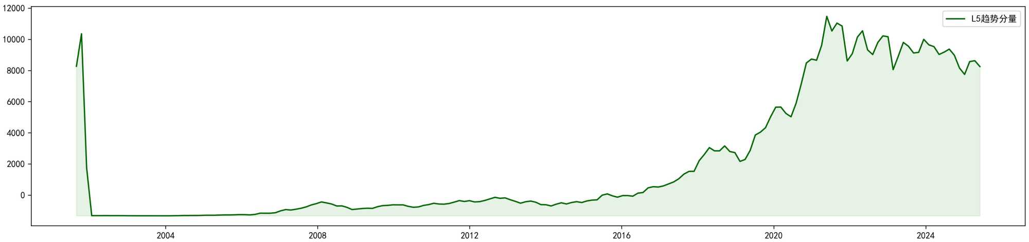 上述图,分为三个部分,每个部分都有其特定的分析目的和展示内容。第一部分(图1):蓝色曲线代表原始价格,呈现出股价在较长时间内的实际波动情况,波动较为频繁且复杂,包含了各种市场因素导致的短期和长期价格变动。红色曲线代表去噪信号,相较于原始价格曲线更加平滑。通过小波分析的去噪处理,去除了一些高频噪声和短期干扰,更能体现股价的整体走势。第二部分(图2):绿色曲线标记为“L5趋势分量”,展示了贵州茅台股价在长期内的上升趋势,前期增长较为平缓,后期增长速度加快。绿色阴影区域位于曲线下方,展示了趋势分量在不同时间点的波动范围,体现了趋势的稳定性和变化区间。第三部(图3)分:不同颜色曲线分别代表D1~D5细节分量,这些曲线体现了股价在不同高频尺度下的波动情况。高频波动较为杂乱,反映了短期内股价受各种市场消息、投资者情绪等因素影响产生的快速变化。检测到主要周期为2个交易日,意味着通过分析这些高频细节分量,发现股价在短期内存在以2个交易日为周期的波动模式。