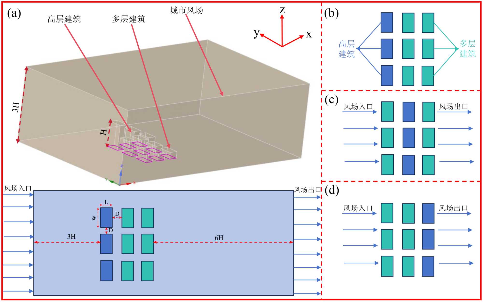 Figure 1. Physical model of urban wind farm environment: (a) Overall model; (b) The high-rise building complex is located upstream; (c) The high-rise building complex is located in the middle reaches; (d) The high-rise building complex is located downstream